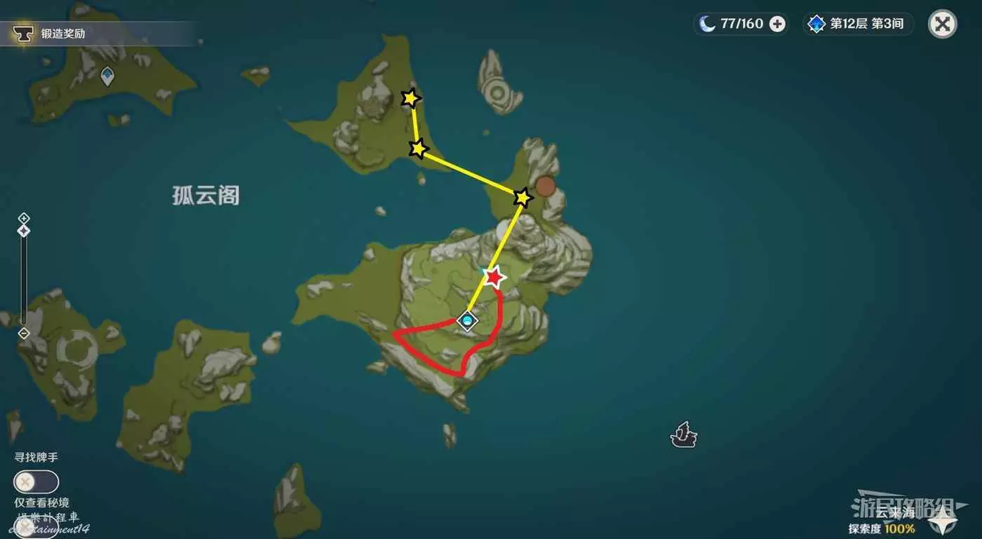 傳送到璃月孤雲閣上的秘境傳送錨點。傳送完畢後,貼著秘境門左側離開岩窟,然後繼續左轉上山,山上有3個深淵法師(下圖紅色路線)。