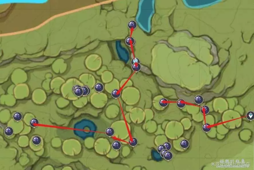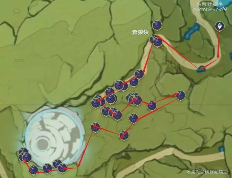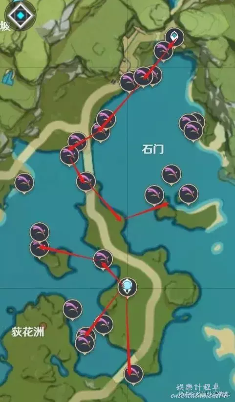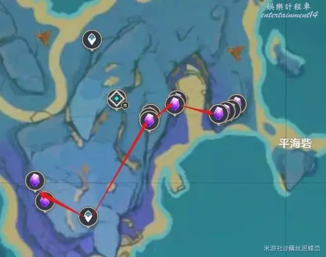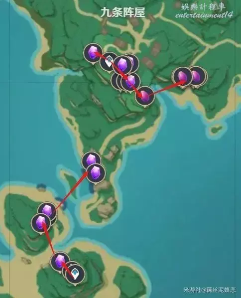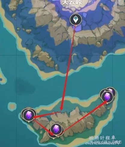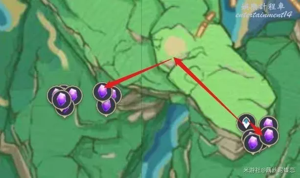 稻妻清籟島越石村傳送錨點附近(圖片中部的部分紫晶礦因為地處地下不方便採集,因此沒有標記路線)