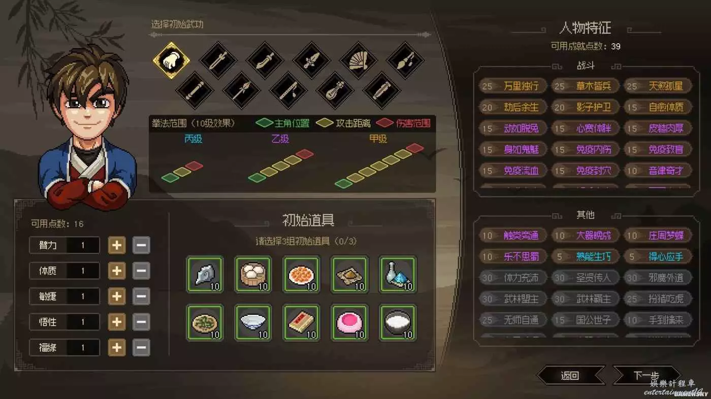 角色創建頁面分為四個板塊,初始武功、五維屬性、初始道具、人物特徵。