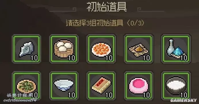 可以選擇10種道具進入遊戲,其中行氣散、跌打藥、蜜淺果子、饅頭、糯米漿可以恢復血量、內力與體力。