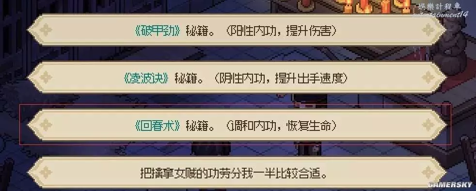 1、開局三選一的武學推薦選擇回春術,前期可以大幅增加推圖的效率。