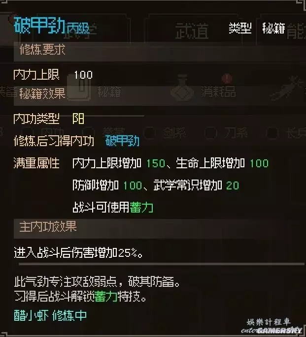 前期的武學三選一選擇【破甲勁】,進入戰鬥後可以獲得25%的傷害提神。
