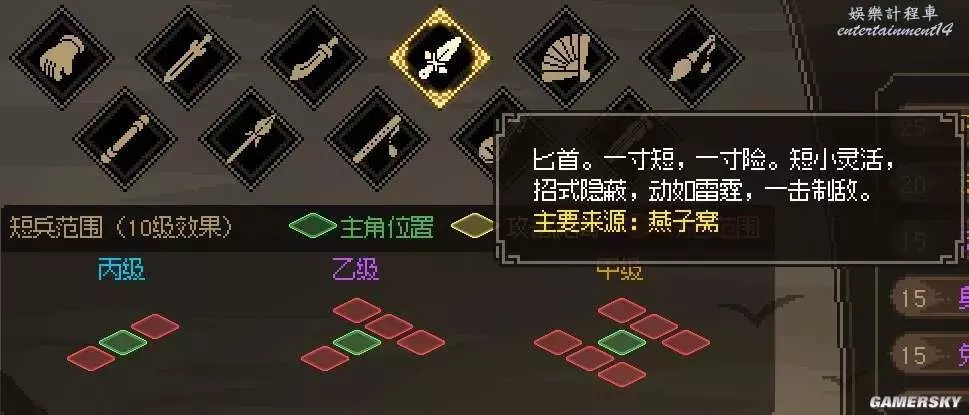 匕首:單體背刺傷害較高,攻擊範圍極小。