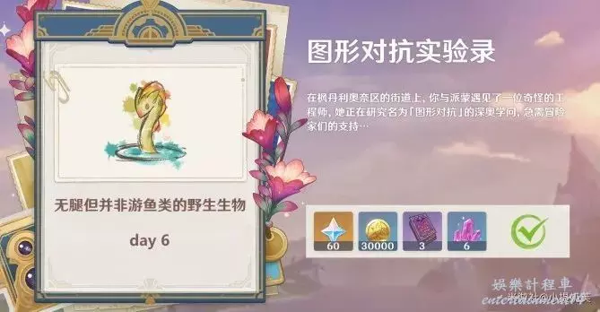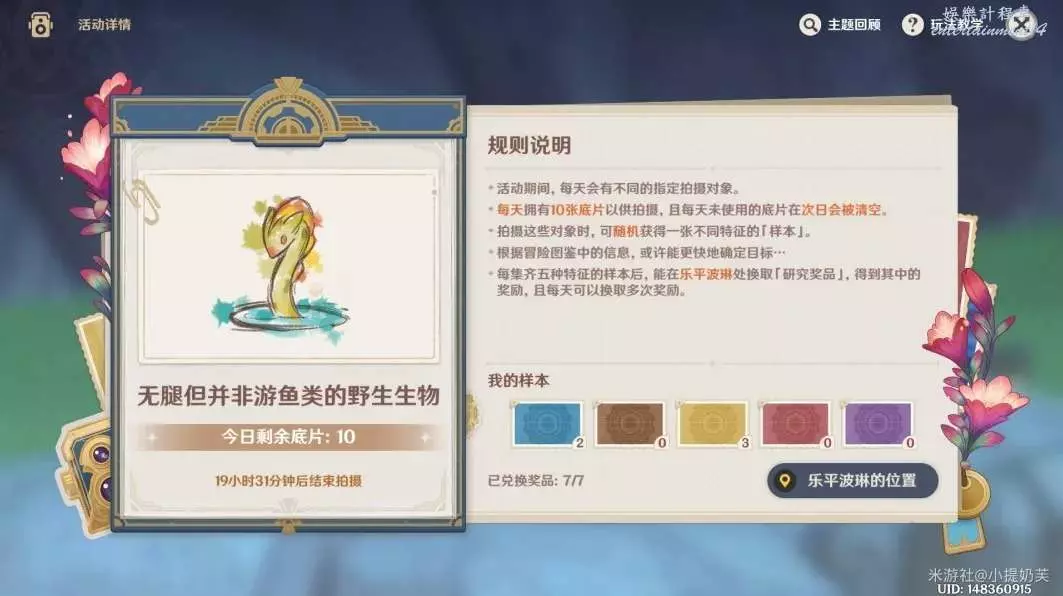 按圖中條件收集5個不同類型的「樣本」交付樂平波琳,可兌換1盒獎品。(60原石、3萬摩拉、3個大英雄的經驗、6個精鍛用魔礦)