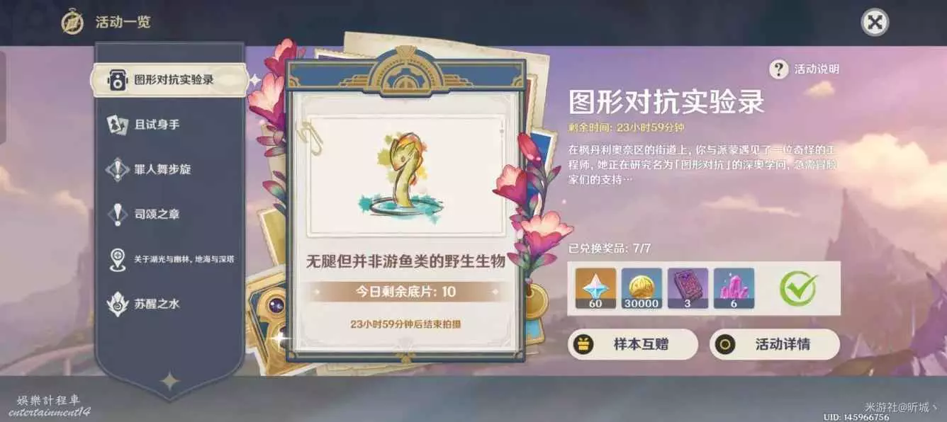 原神 (Genshin Impact) 圖形對抗實驗錄Day6拍照指南 22 11 月 2023-11-22 廣告 作者:昕城丶 來源:米遊社論壇 活動最後一天了!今天要找的“無腿但並非遊魚類野生生物”,試過的有晶蝶和鰻,下面是幾個離錨點近的點位(最好是帶上早柚或者瑤瑤)。 ①楓丹廷左邊錨點,三隻; ②楓丹廷右下角天賦本門口,三隻; ③幽林霧道,三隻; ④莫爾泰神像,四隻; ⑤沙蟲洞錨點,三隻流沙鰻鰻; ⑥無相草錨點左上角的錨點,三隻; ⑦無相草錨點,三隻; ⑧璃月層岩巨淵神像,三隻; ⑨稻妻清籟島平海砦錨點,三隻。