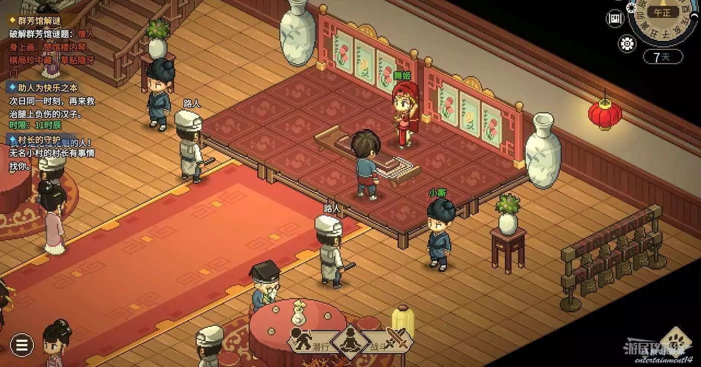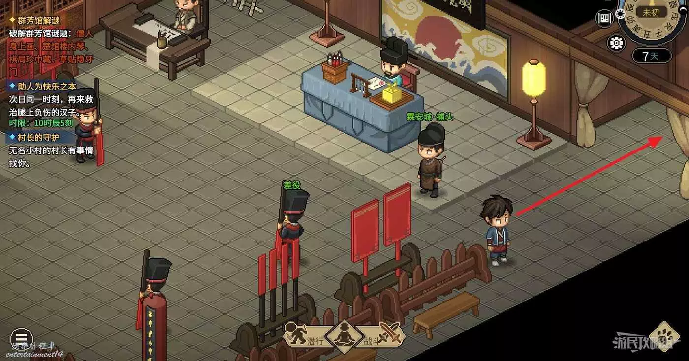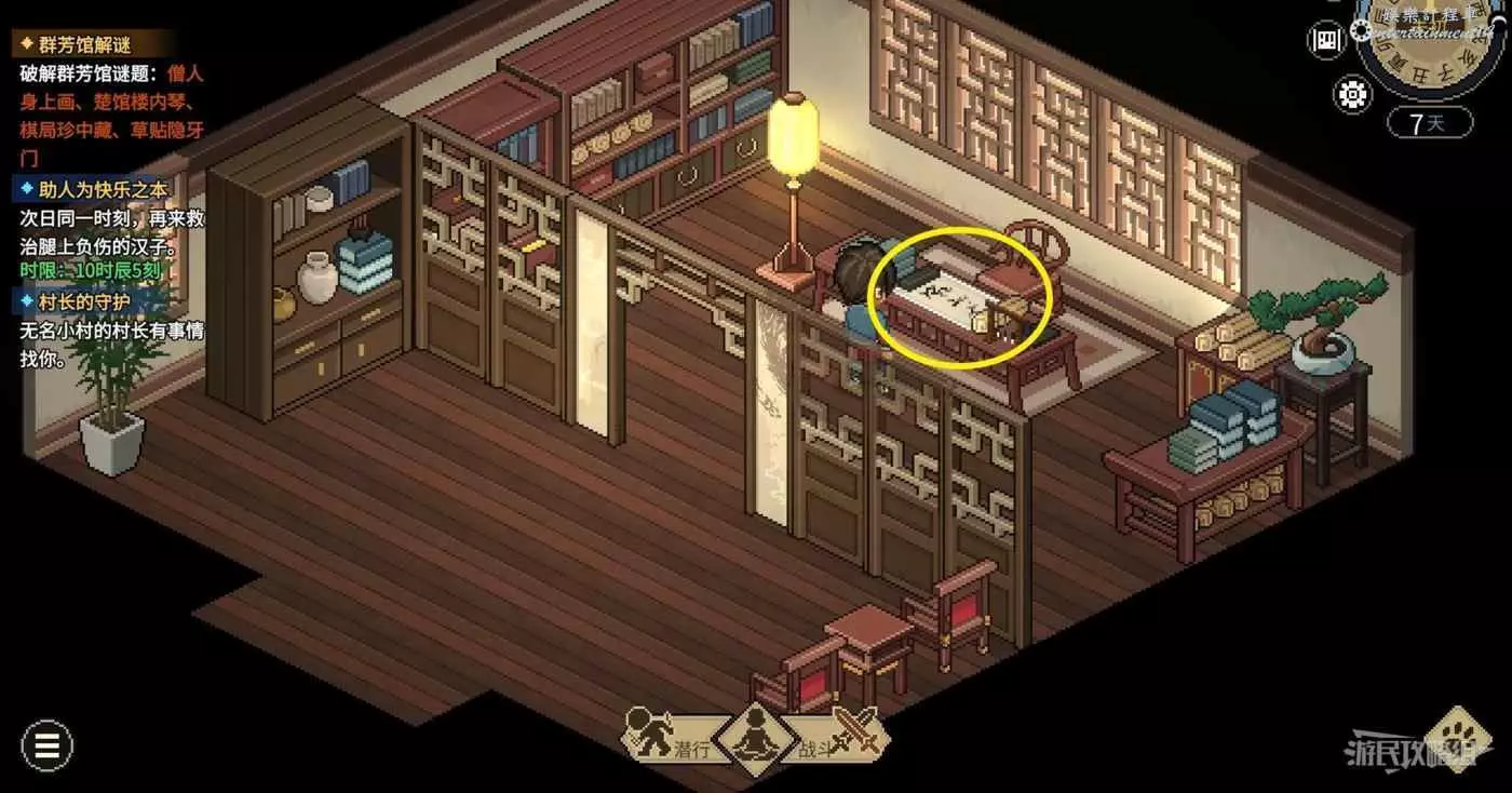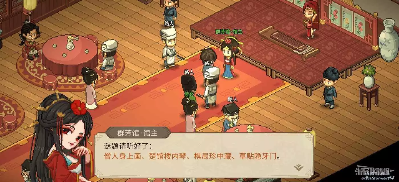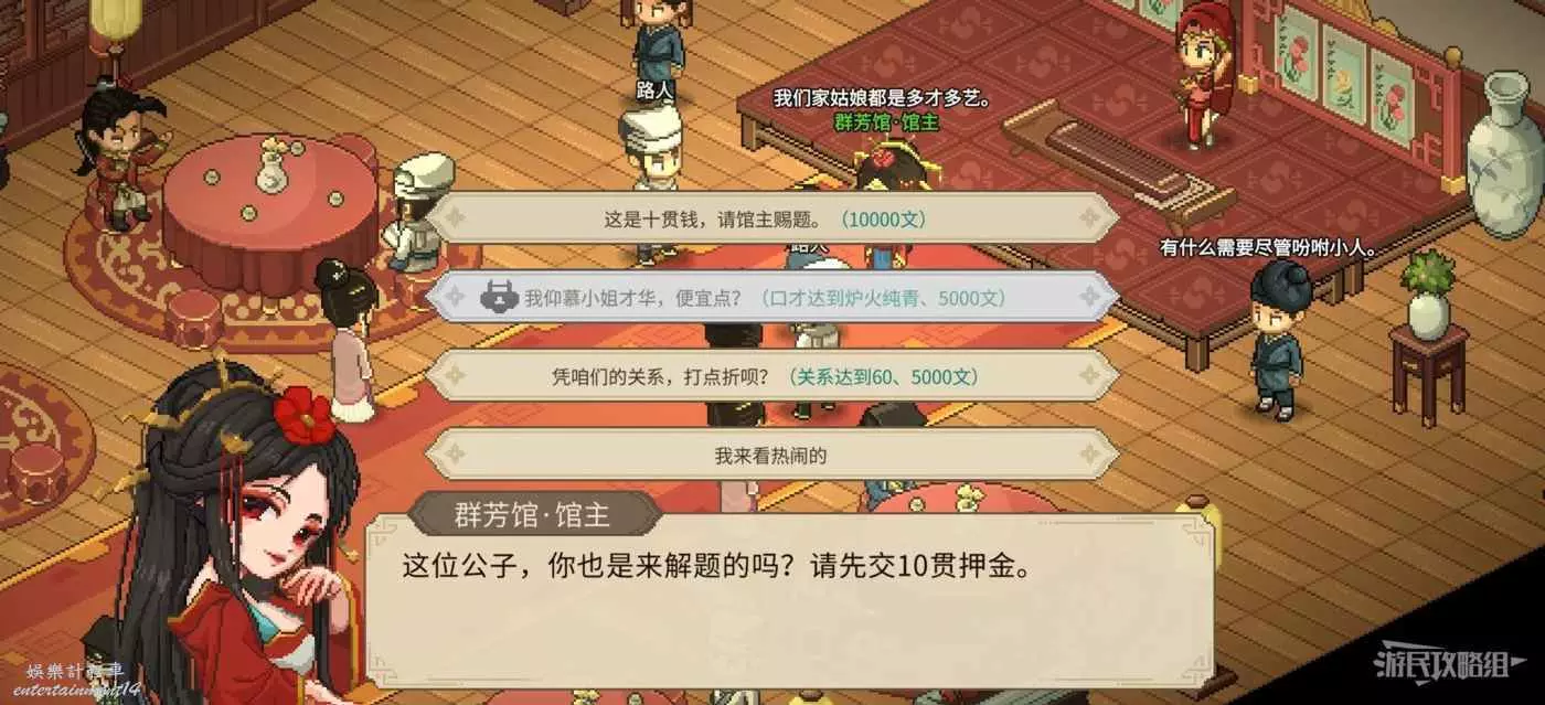注意獲得謎題需要滿足三種條件中的任意一個。給群芳館館主送禮提升好感之後,只要關係達到60就能只花5貫獲得謎題。或者在口才達到4級爐火純青時花5貫也可以獲得謎題。最簡單的是去聚財坊把莊家的錢都贏過來,莊家身上的錢都是隨時間累積的,多贏幾次不管5貫10貫都是小意思了。