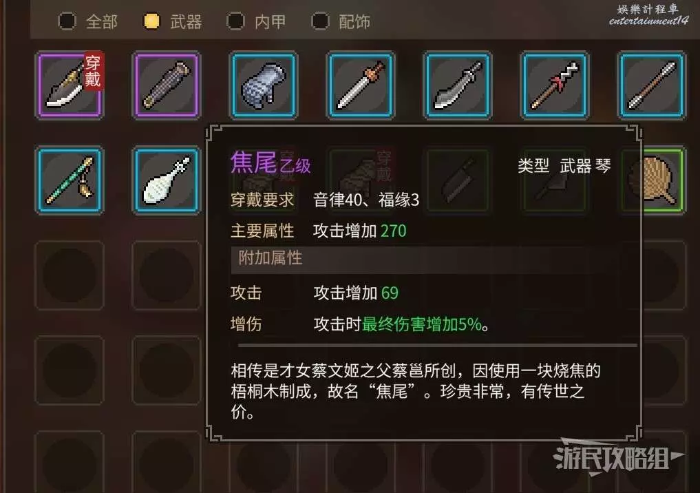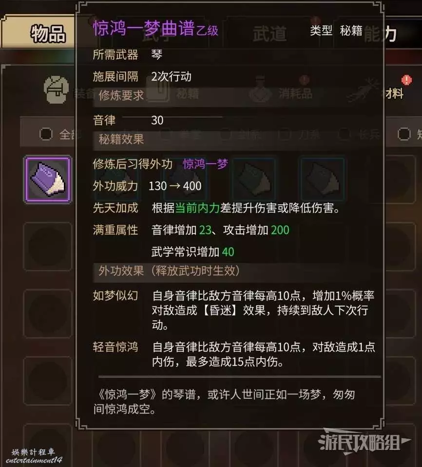 同時獲得乙級武器【焦危琴】,乙級武學【驚鴻一夢】,以及江湖歷練(具體數值根據等級和特性有所變化)。