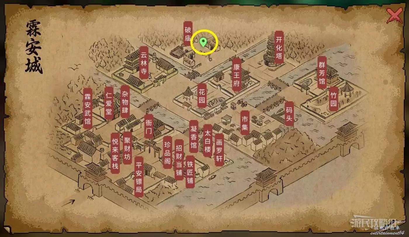 釋嗔位於霖安城左上角的破廟區域,在破房子右側草垛處。