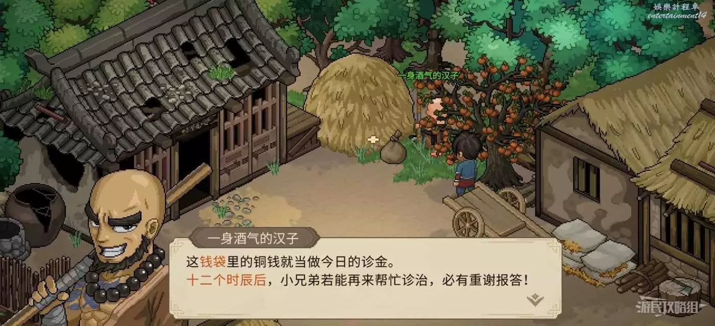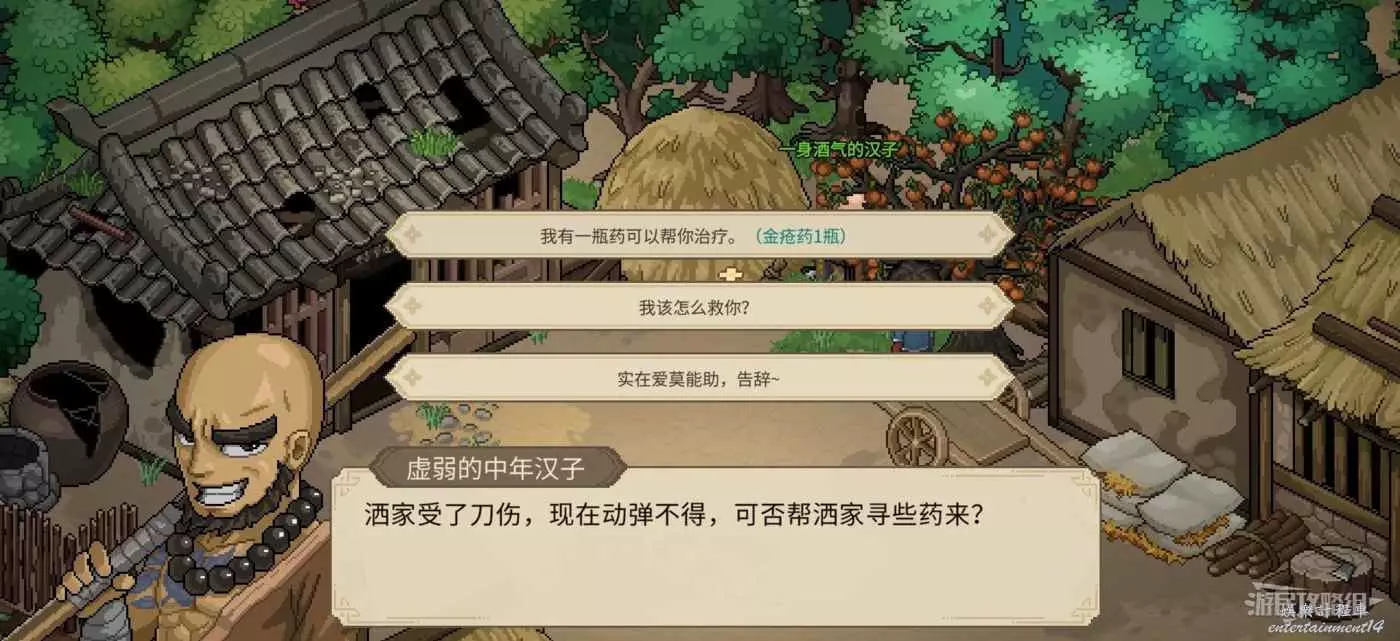與一身酒氣的漢子對話,送禮可以提升好感。但是要先為他治病(每天需要一瓶金瘡藥,連續二到四天)。注意霖安城差役正在搜捕他,如果將其交給衙門的話後續將無法邀請入隊。