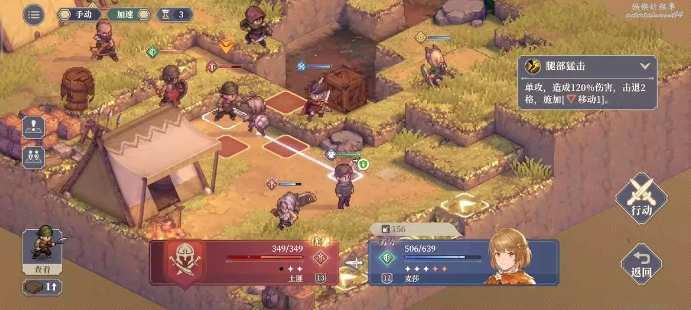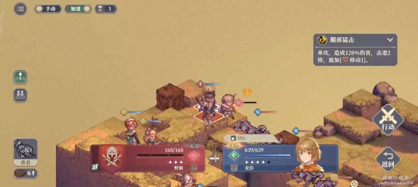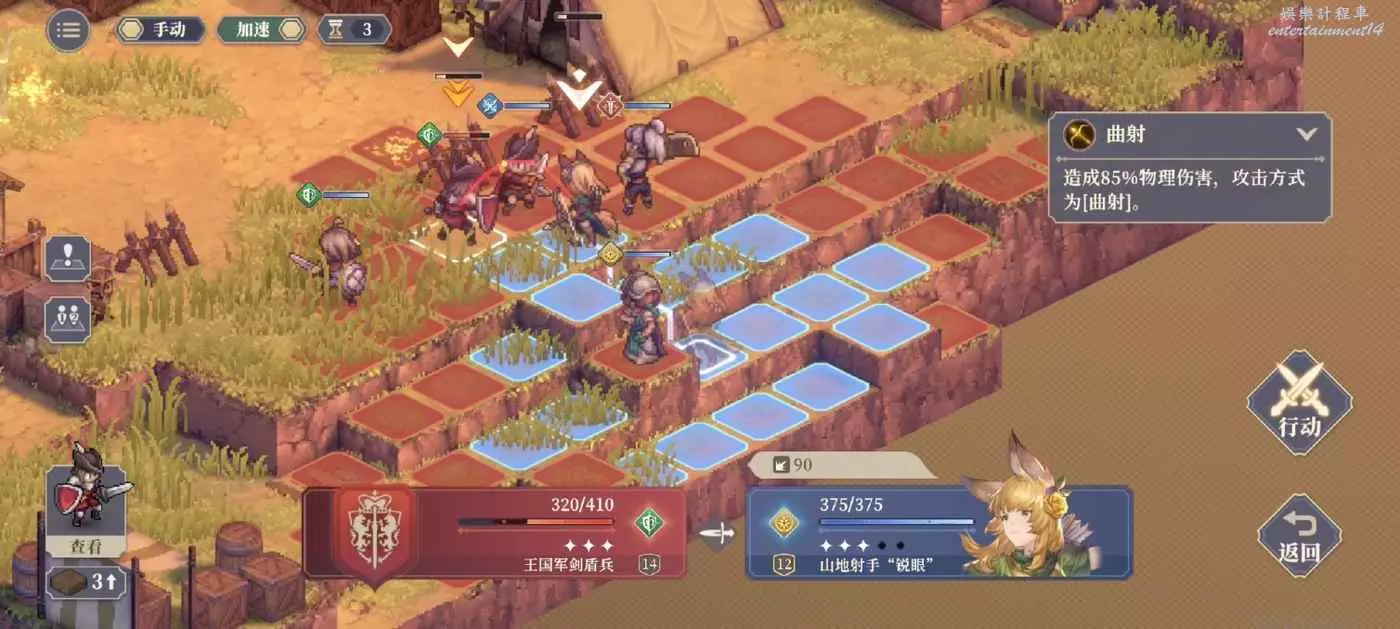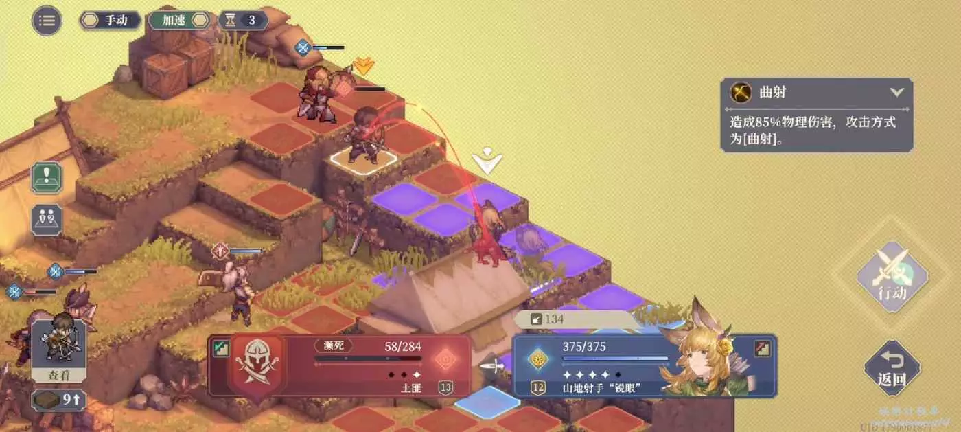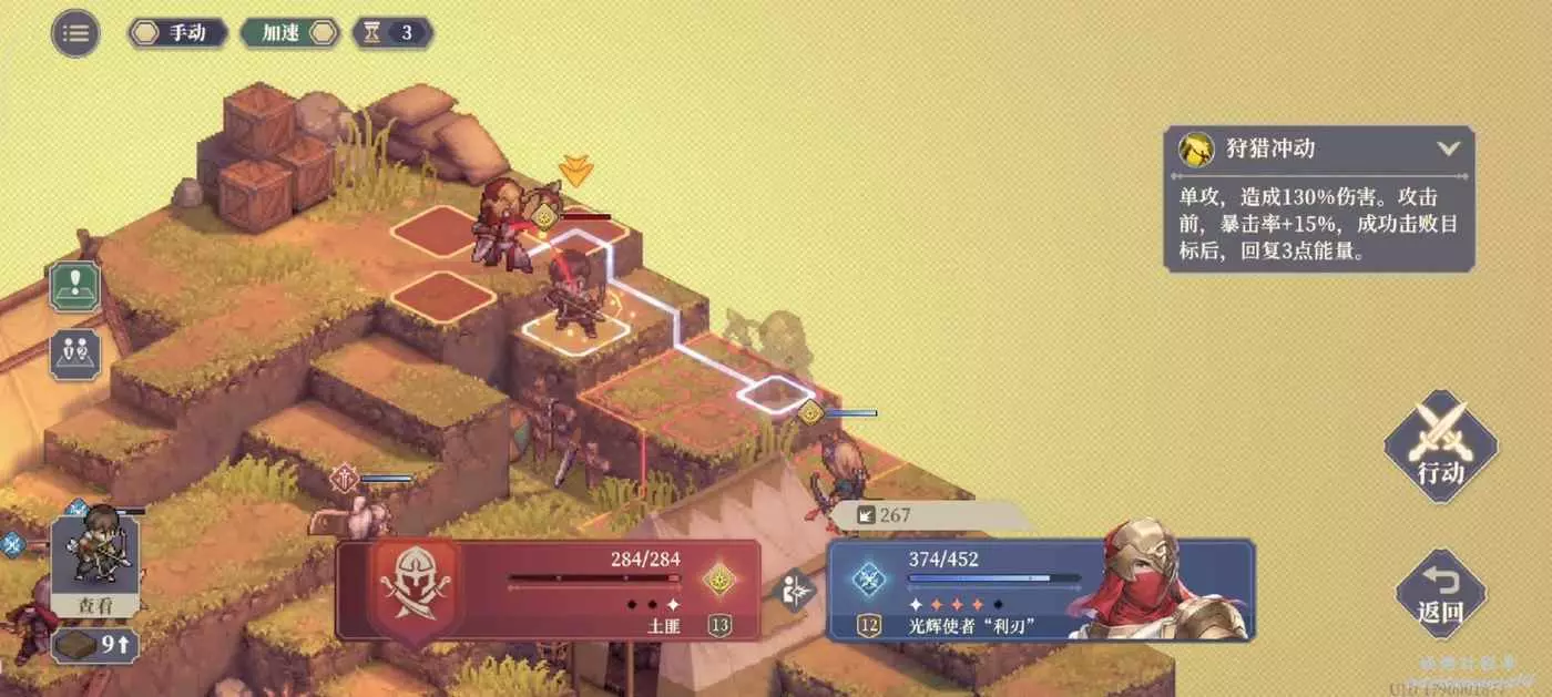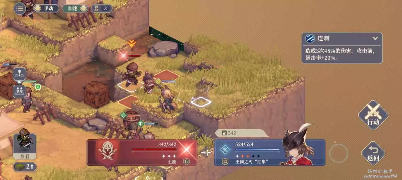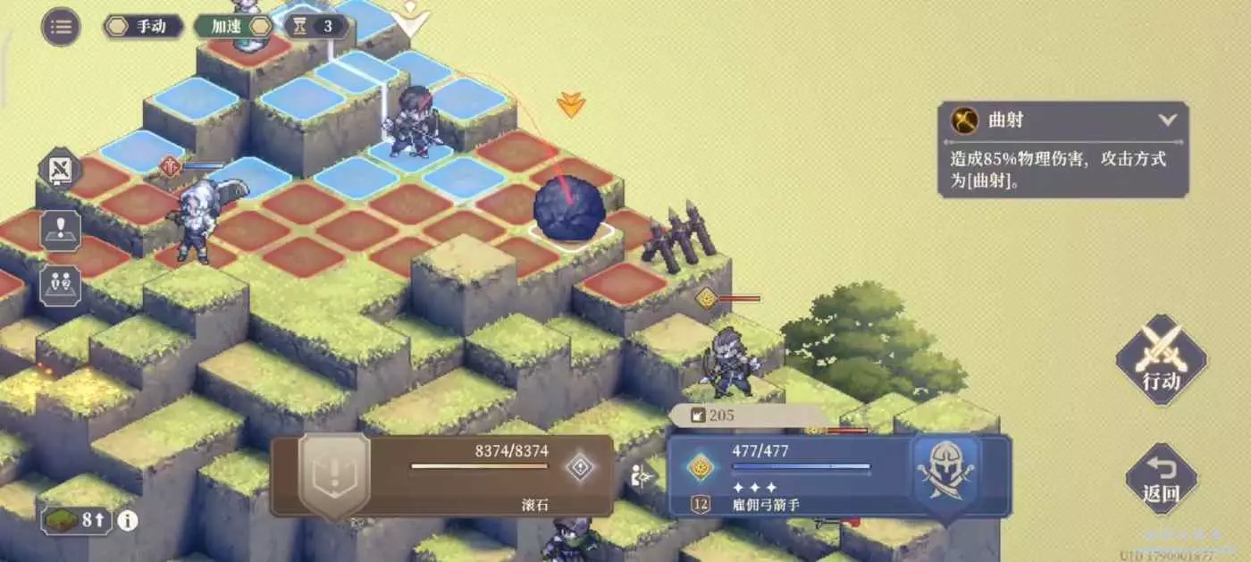 雇傭弓箭手:敵人行動後,施放【普攻】攻擊右側滾石。滾石滾落擊中兩名敵人,兩名敵人被擊敗。