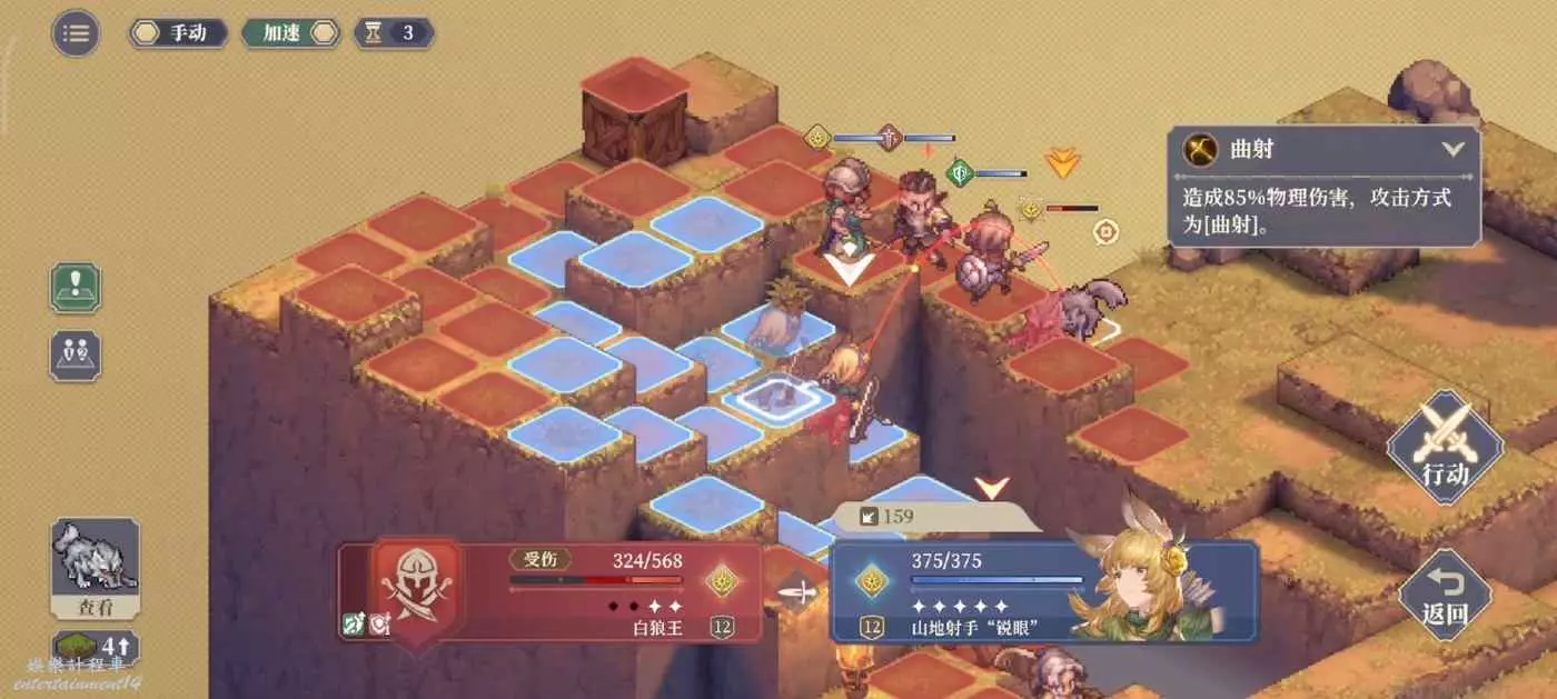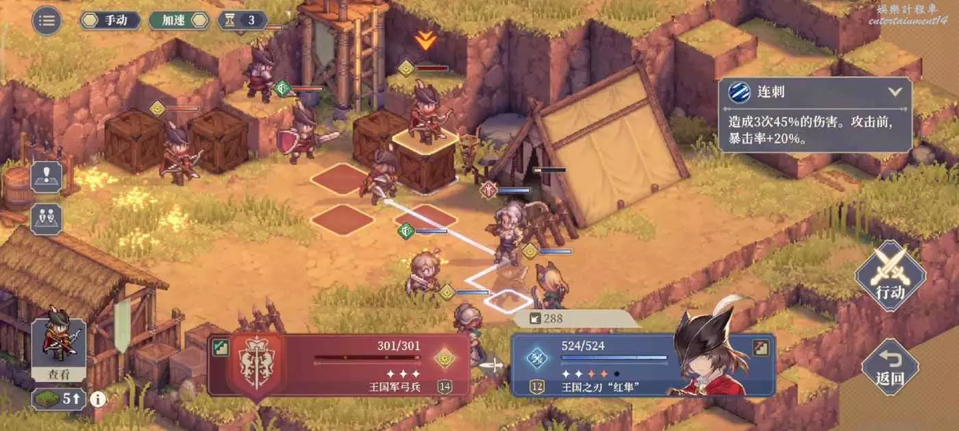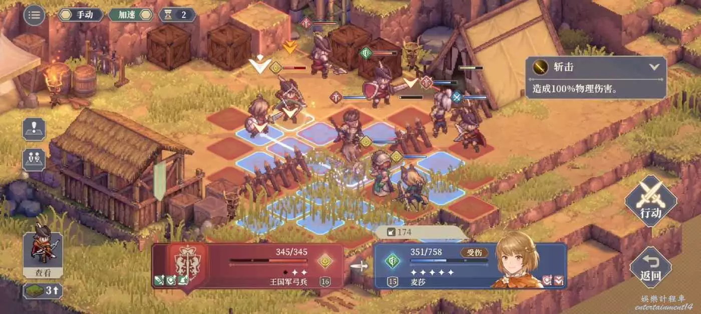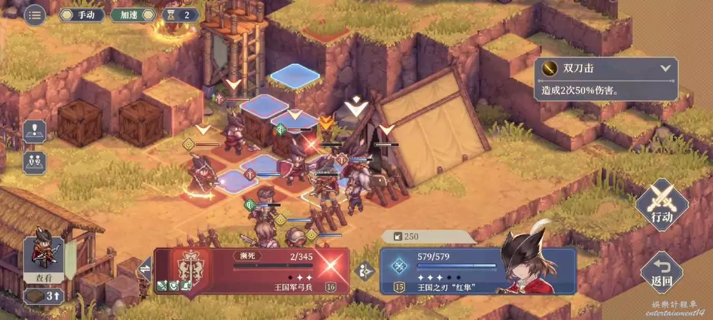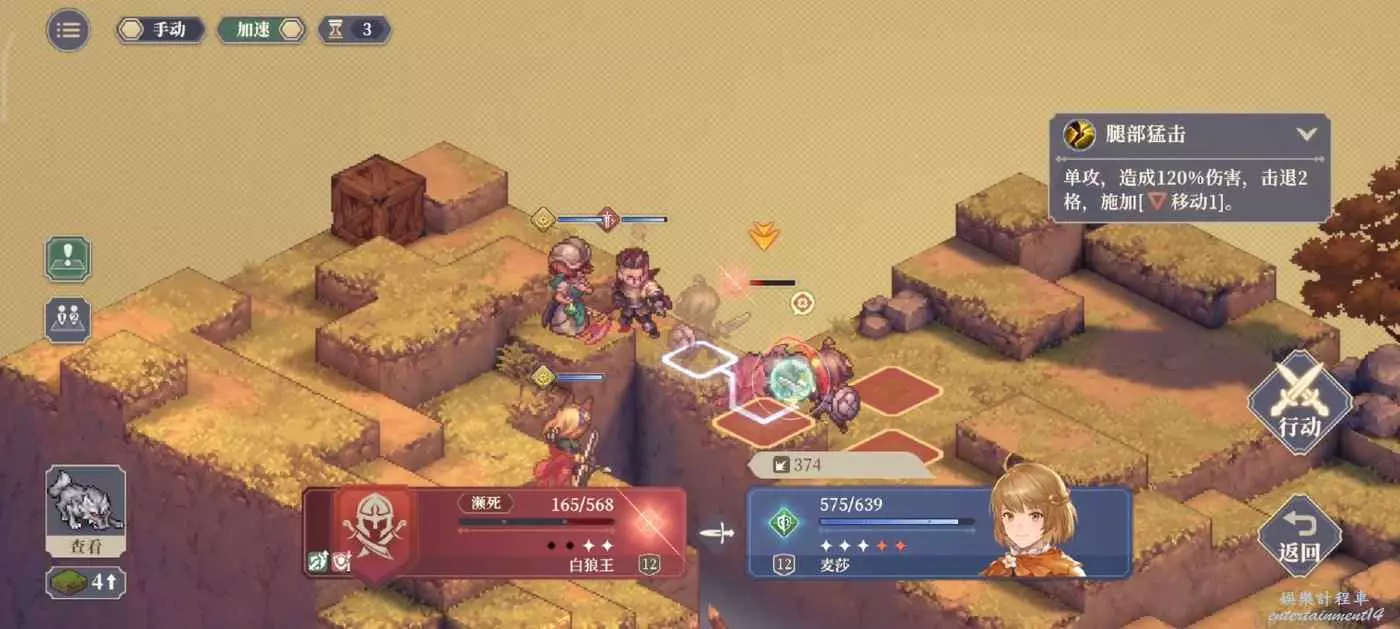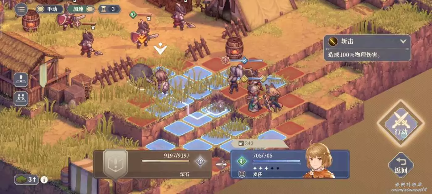 雇傭弓箭手:敵人行動後,施放【普攻】攻擊右側滾石。滾石滾落擊中兩名敵人,兩名敵人被擊敗。