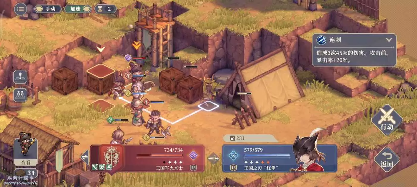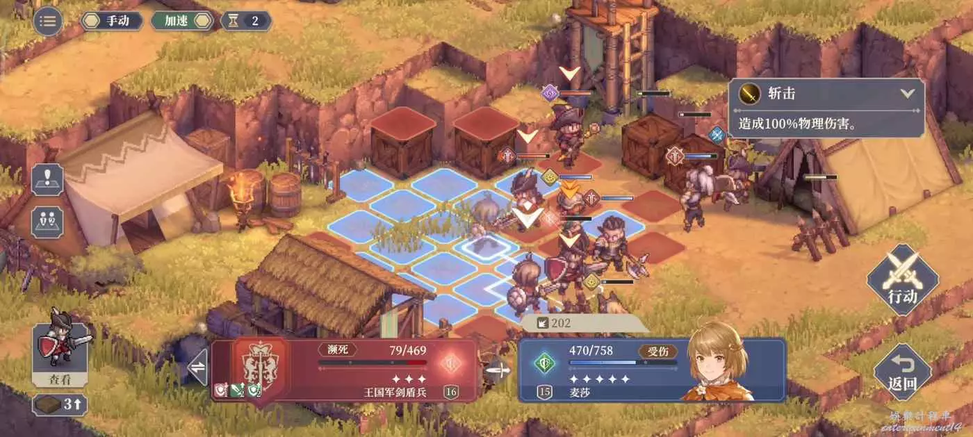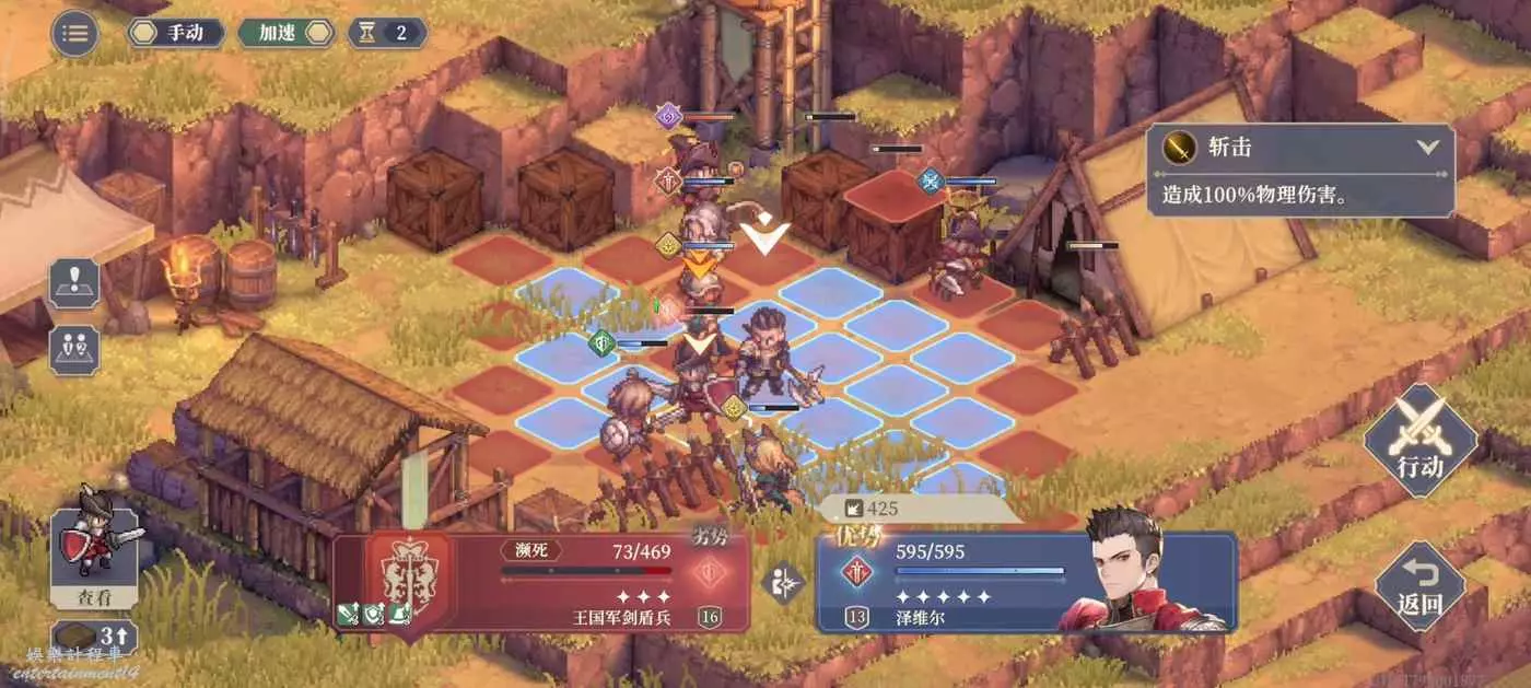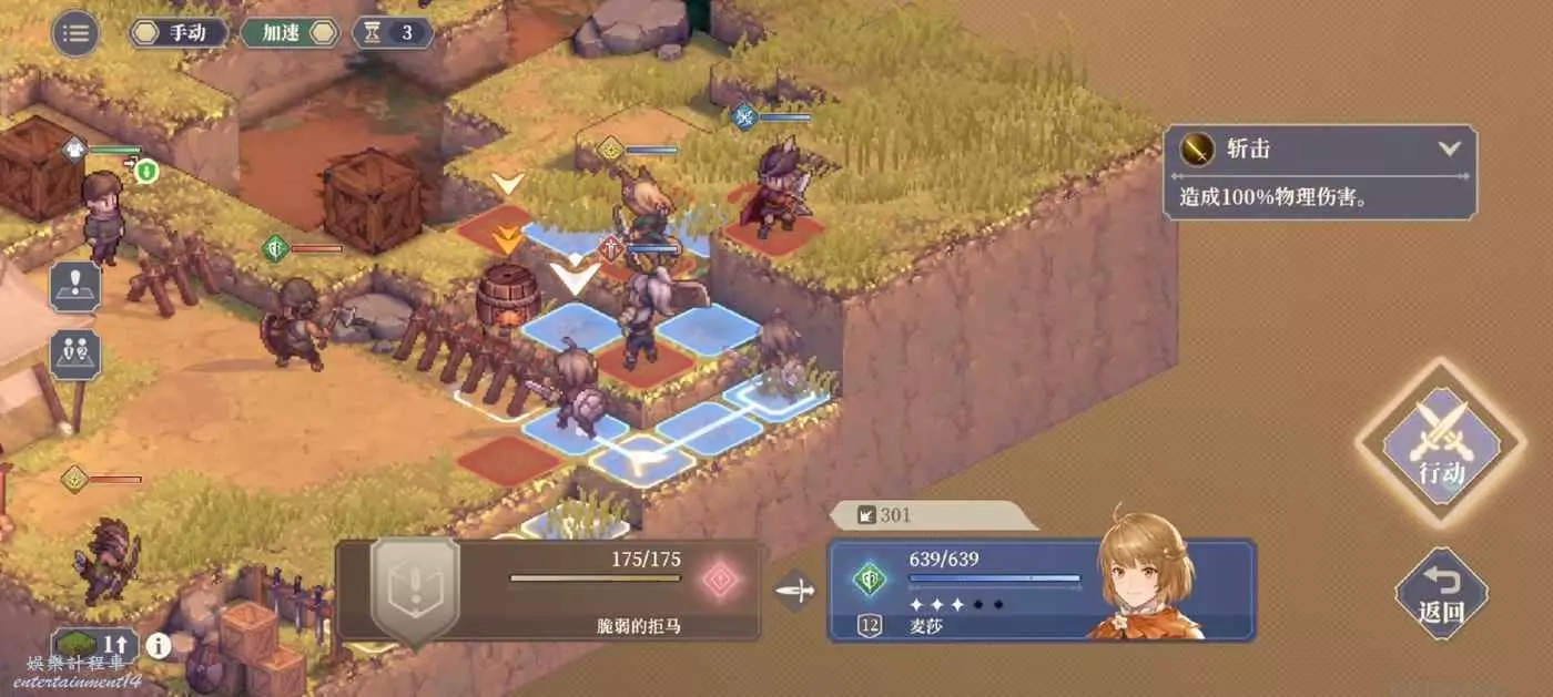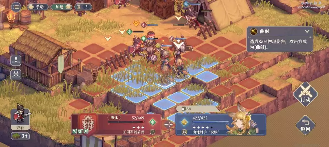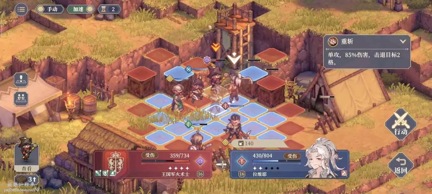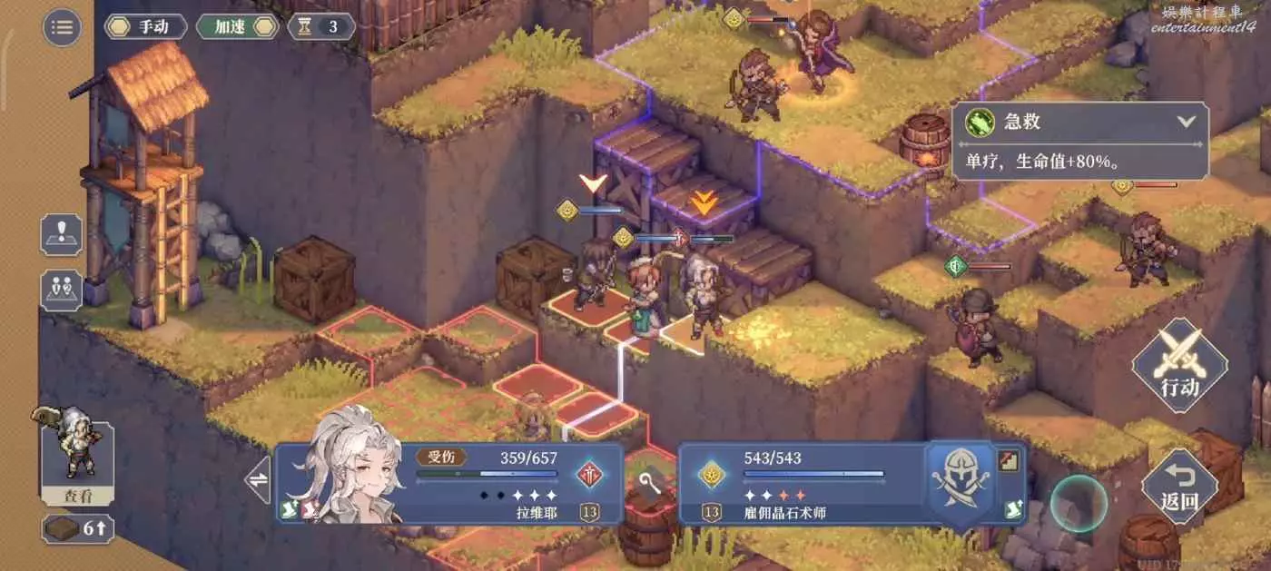 雇傭弓箭手:敵人行動後,施放【普攻】攻擊右側滾石。滾石滾落擊中兩名敵人,兩名敵人被擊敗。