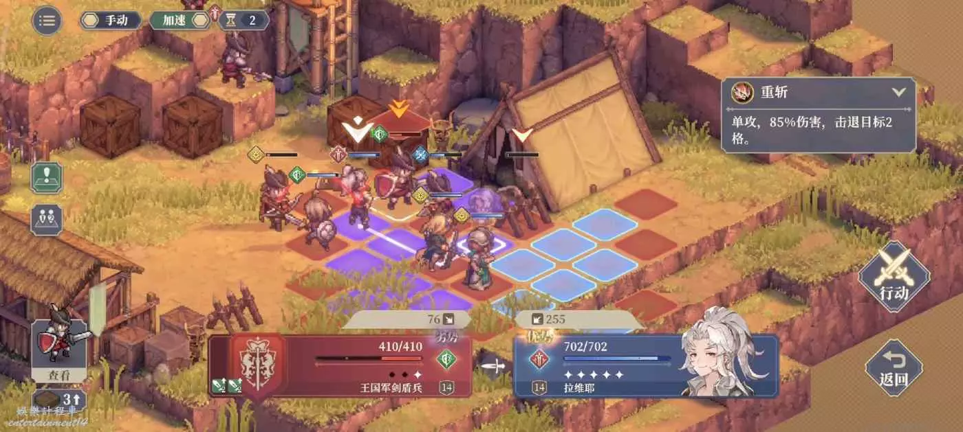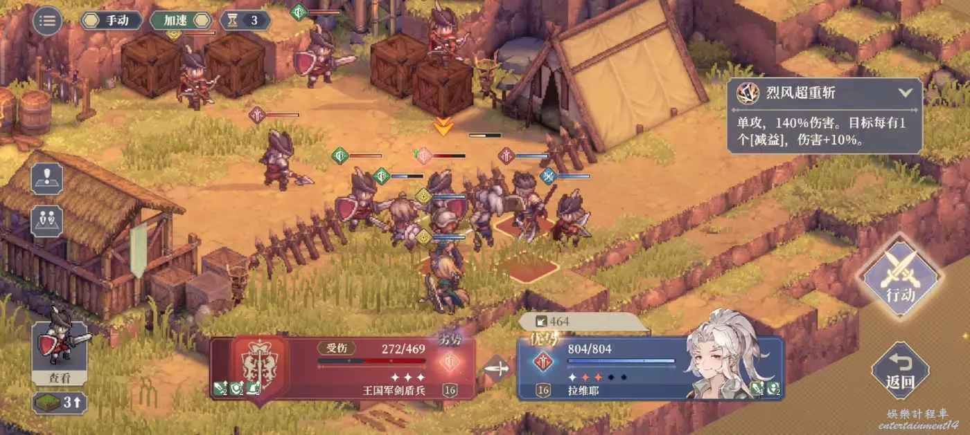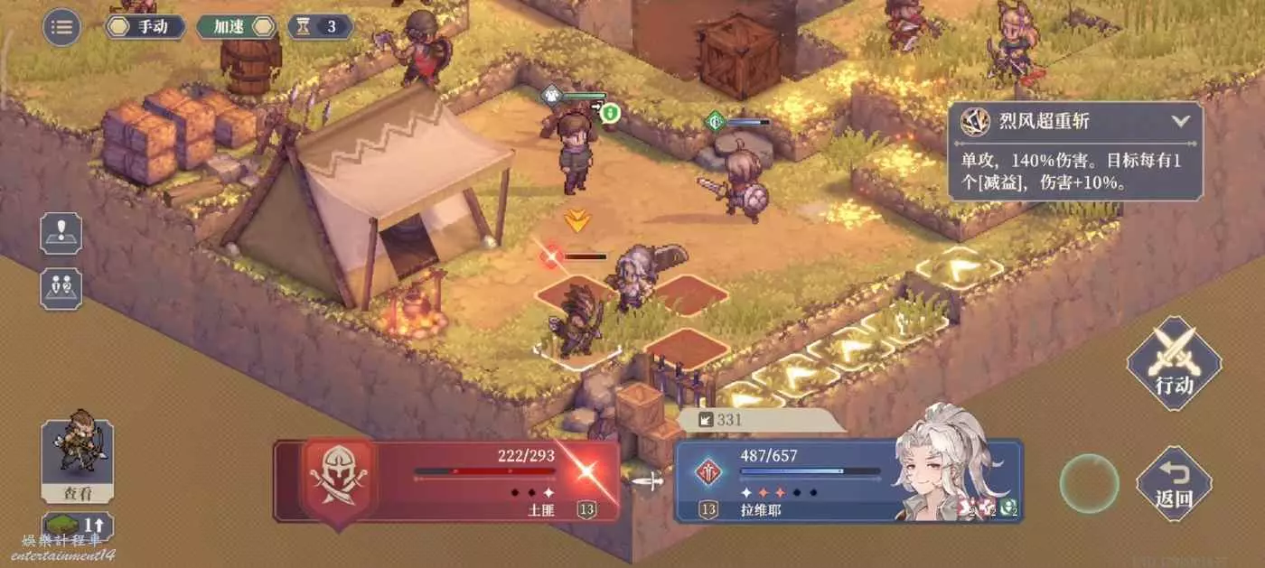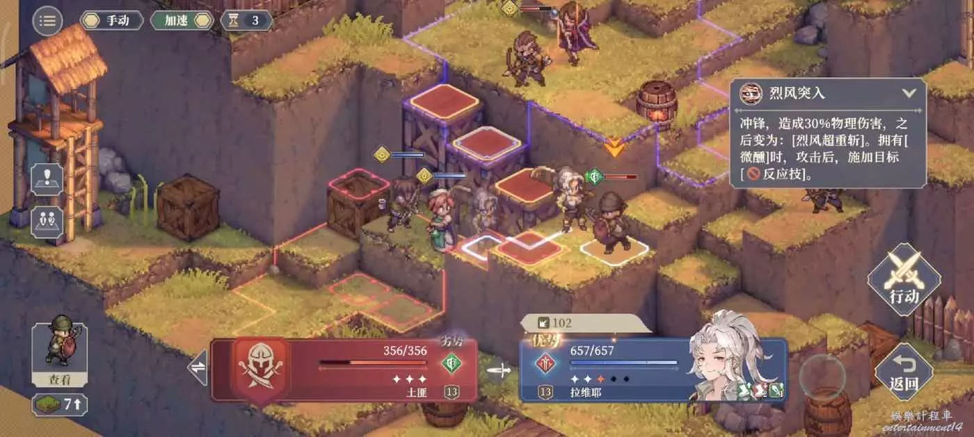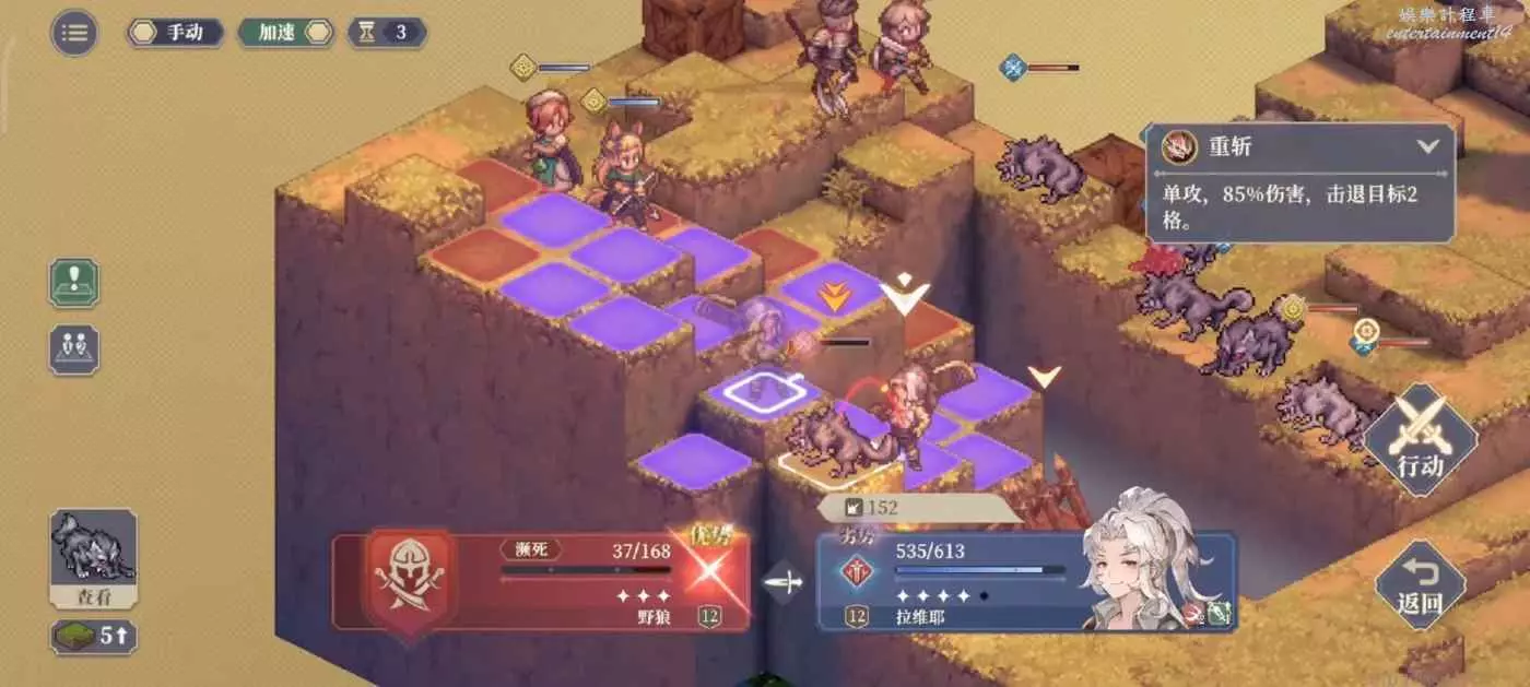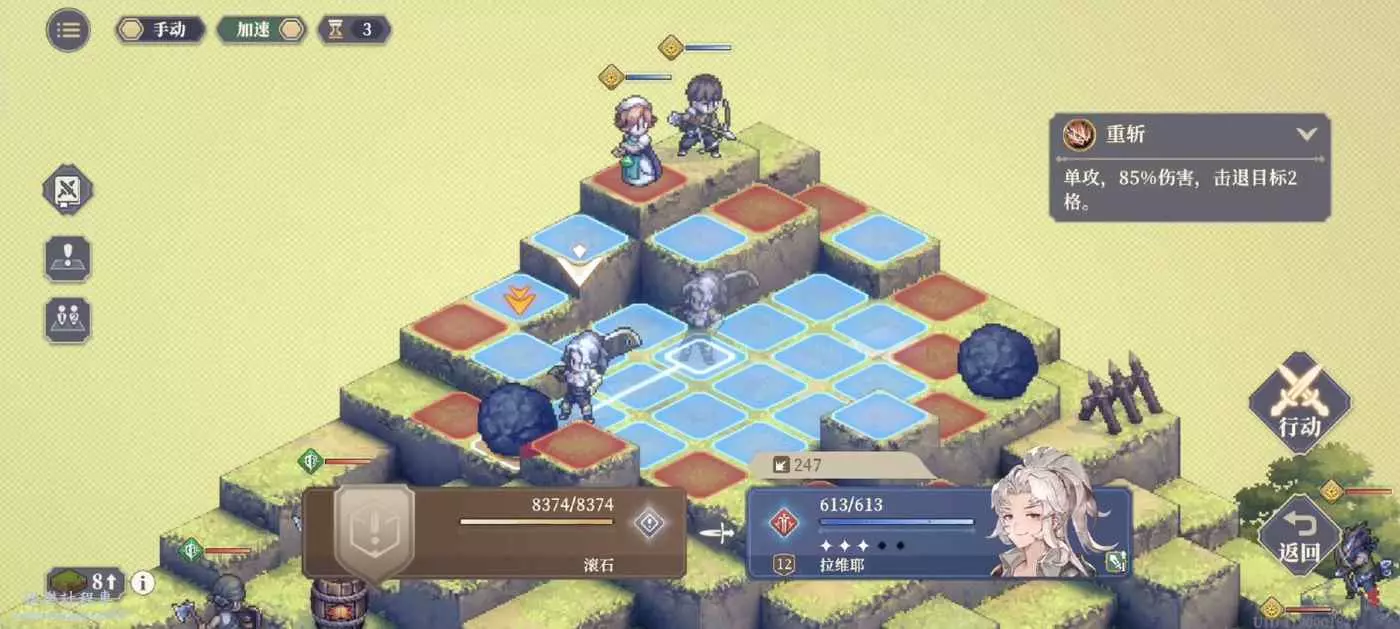 拉維耶:施放【烈風突入】、【烈風超重斬】攻擊距離最近的敵人。目標被擊敗。之後回合一直原地待機即可。