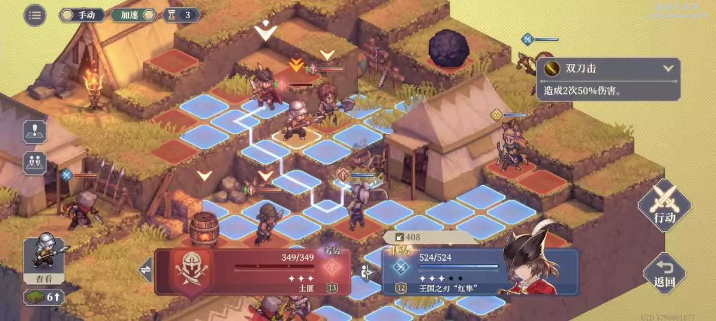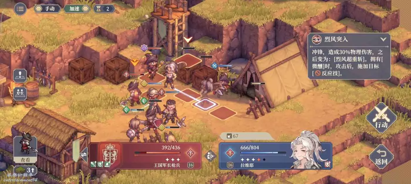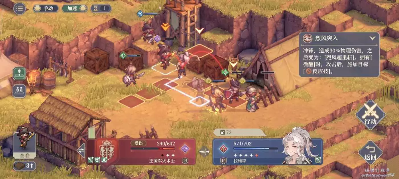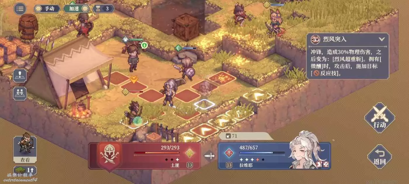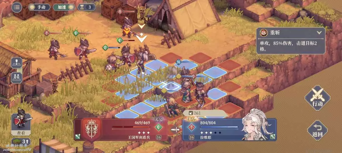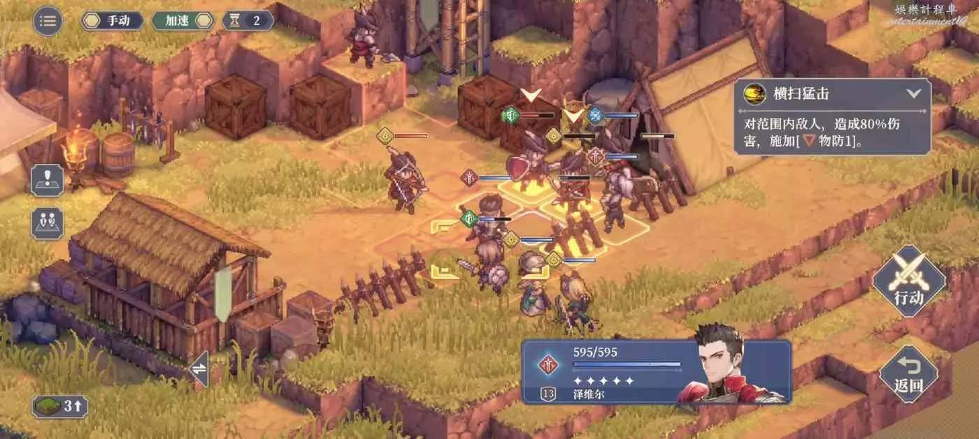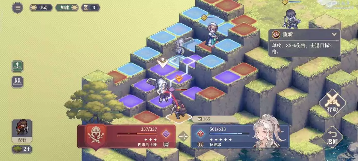 拉維耶:施放【烈風突入】、【烈風超重斬】攻擊距離最近的敵人。目標被擊敗。之後回合一直原地待機即可。