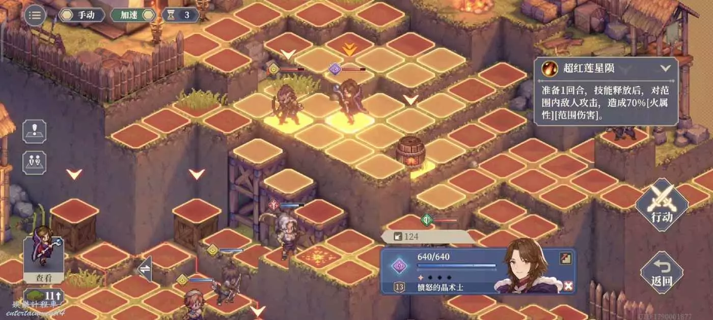 憤怒的晶術師:上回合施放的【超紅蓮星隕】擊敗敵方紅蓮和左側敵方守望者。本回合直接待機即可。