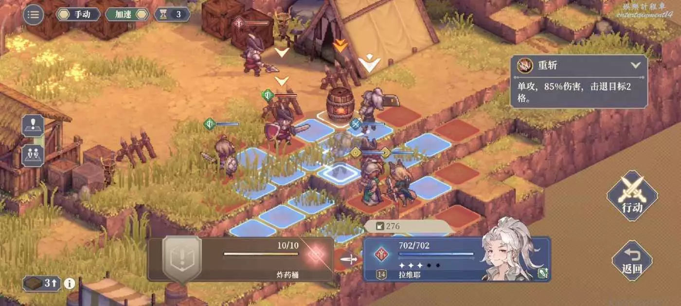 拉維耶:敵人行動後,施放【普攻】攻擊炸藥桶。炸藥桶被擊退爆炸,波及一名敵人,一名敵人被擊敗。