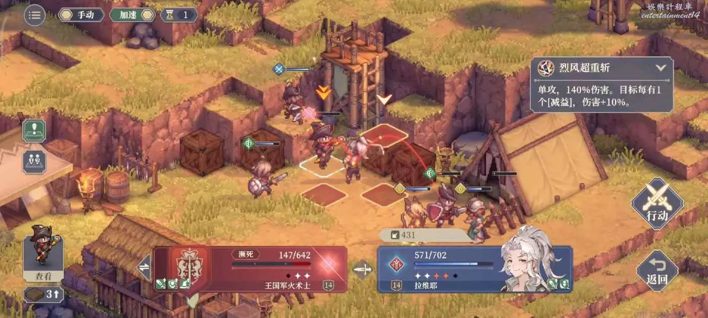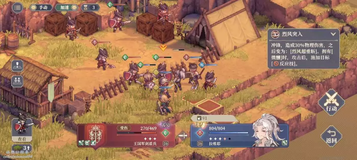 拉維耶:施放【烈風突入】、【烈風超重斬】攻擊距離最近的敵人。目標被擊敗。
