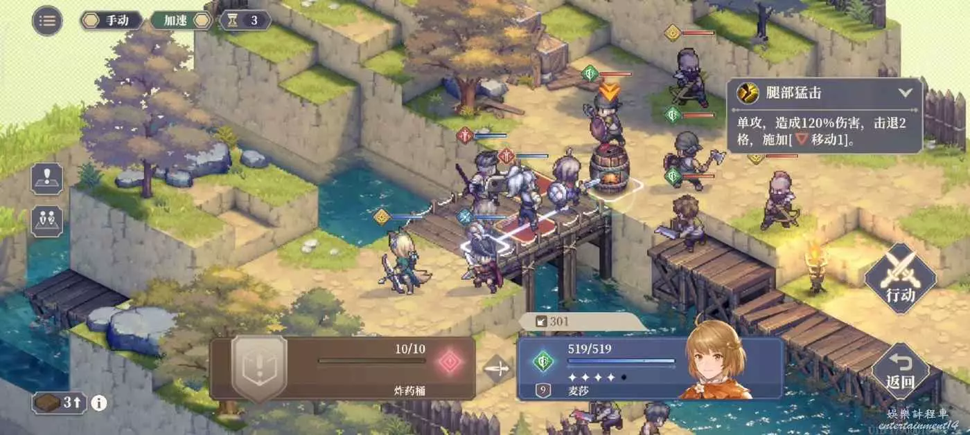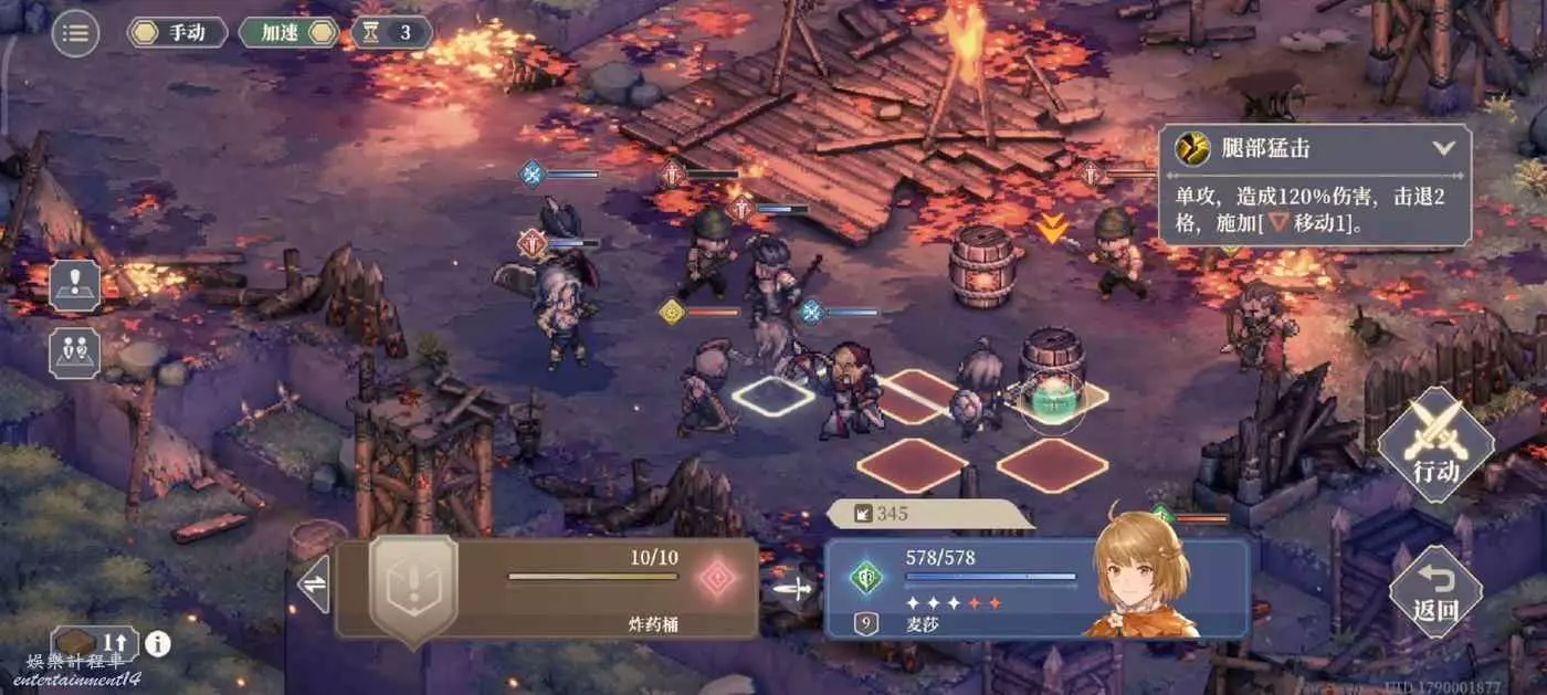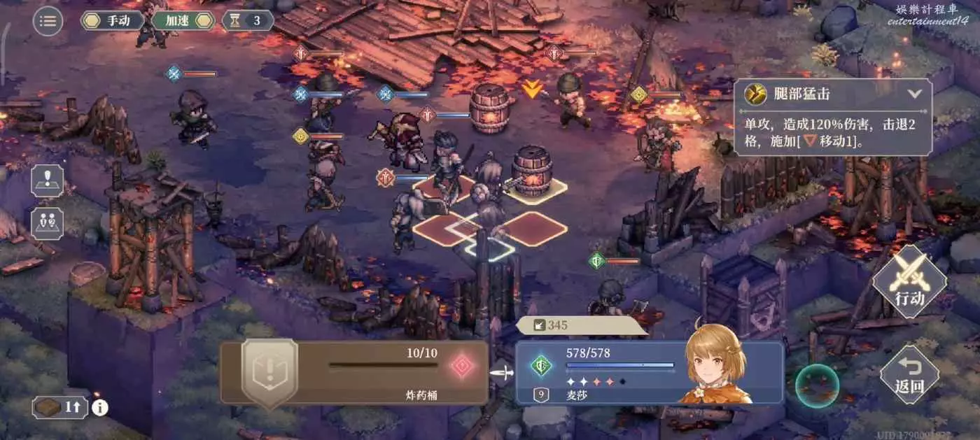 麥莎:施放【腿部猛擊】攻擊炸藥桶。炸藥桶被擊退爆炸,波及三名敵人,三名敵人被擊敗。之後回合一直原地待機即可。
