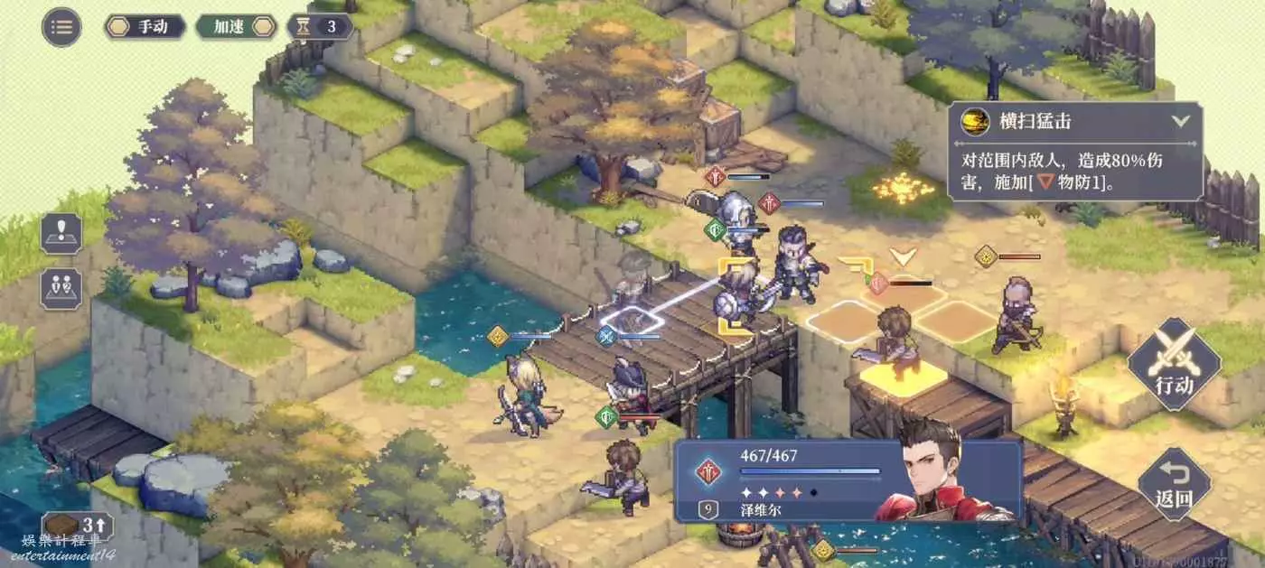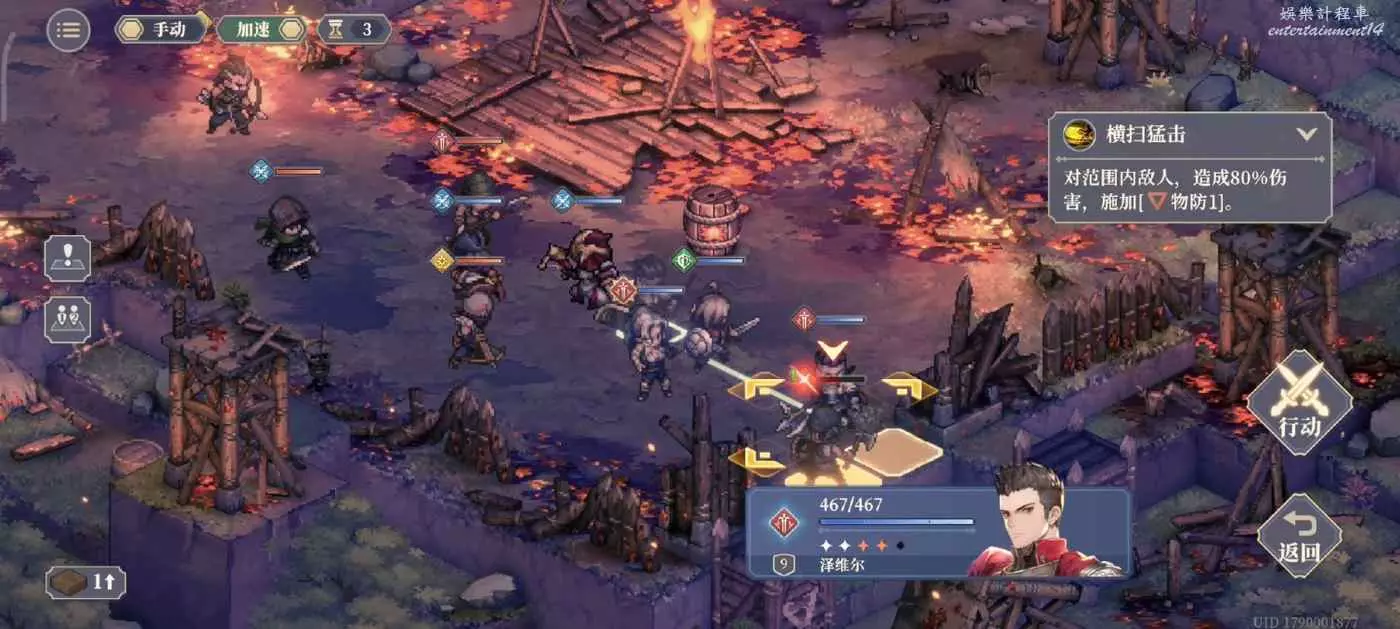 賽維爾:敵人行動後,施放【橫掃猛擊】攻擊兩名敵人。隨後觸發一騎當千,一名敵人被擊敗。之後回合一直原地待機即可。