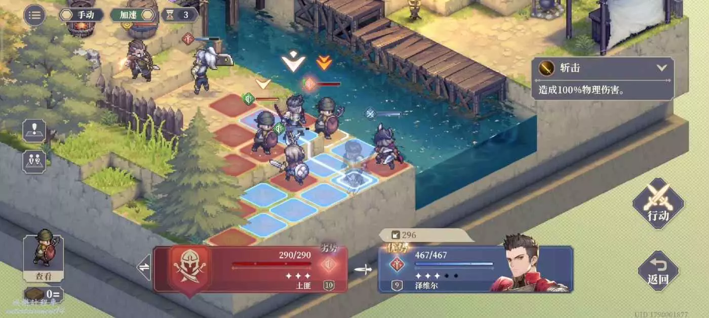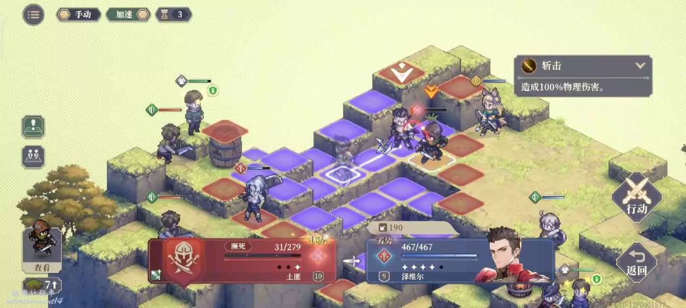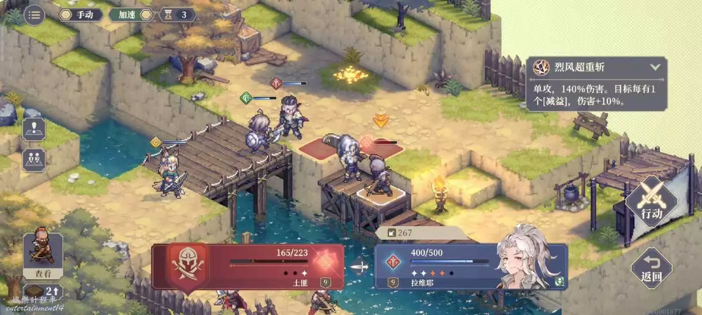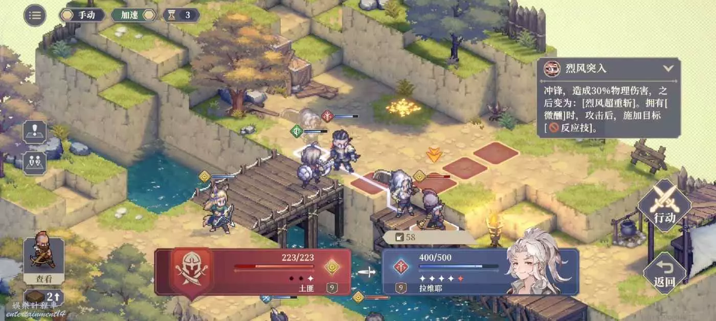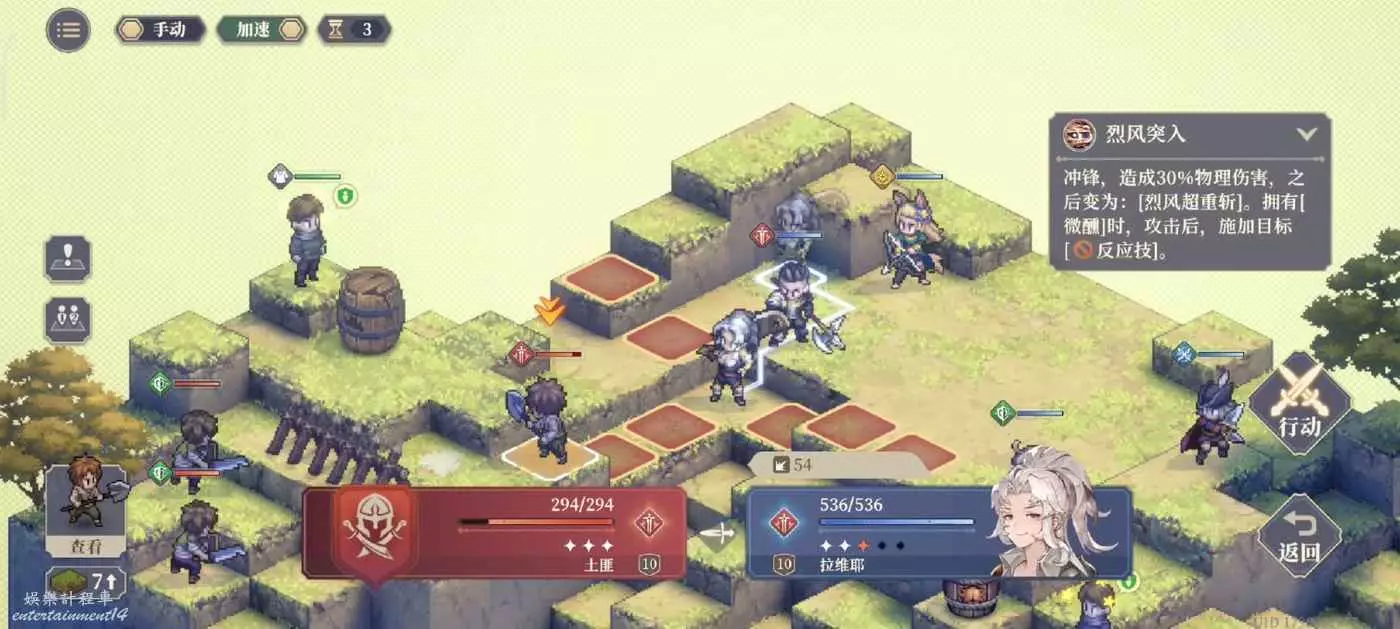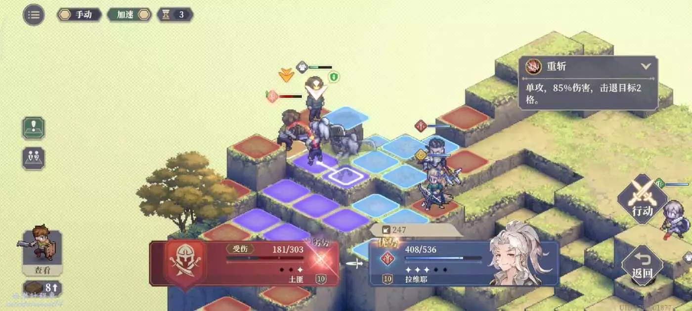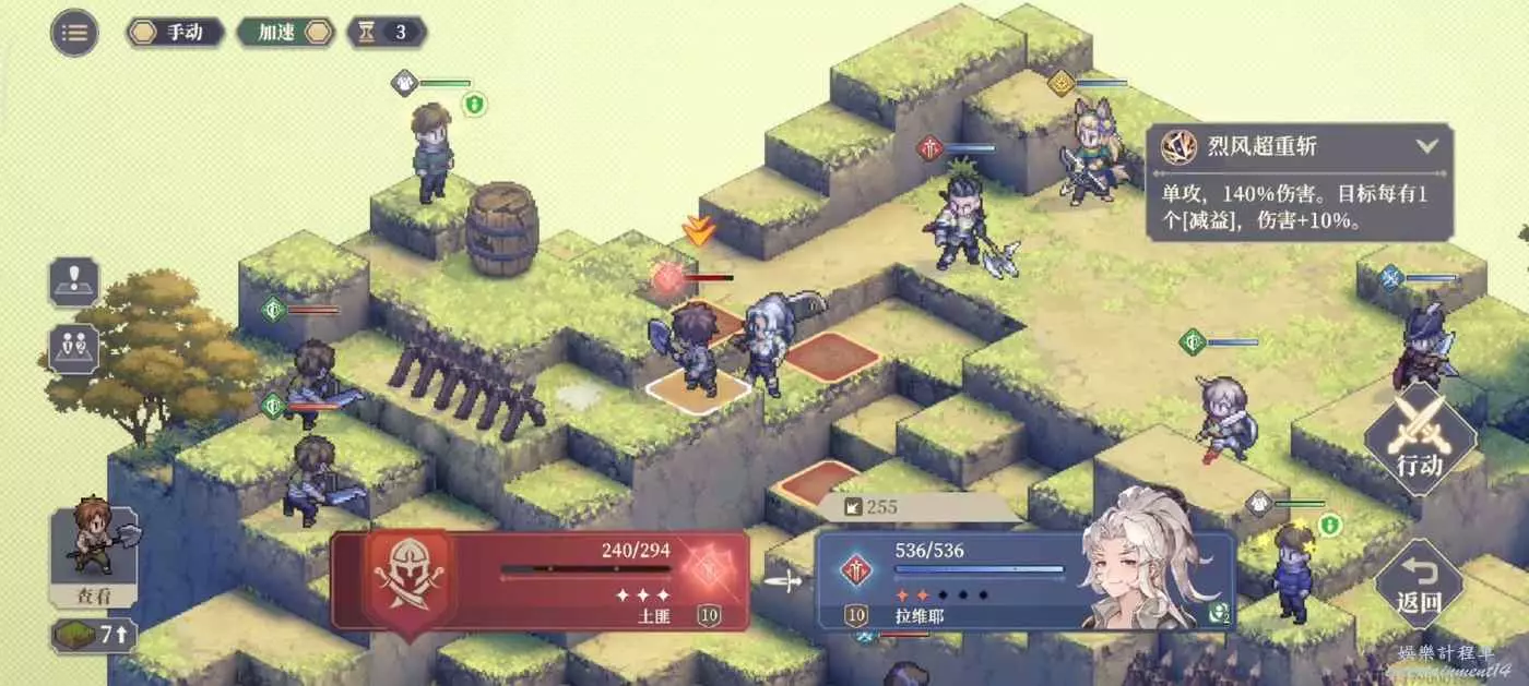 拉維耶:向前移動至最遠格子,施放【烈風突入】、【烈風超重斬】攻擊敵方右側守望者。目標被擊敗。