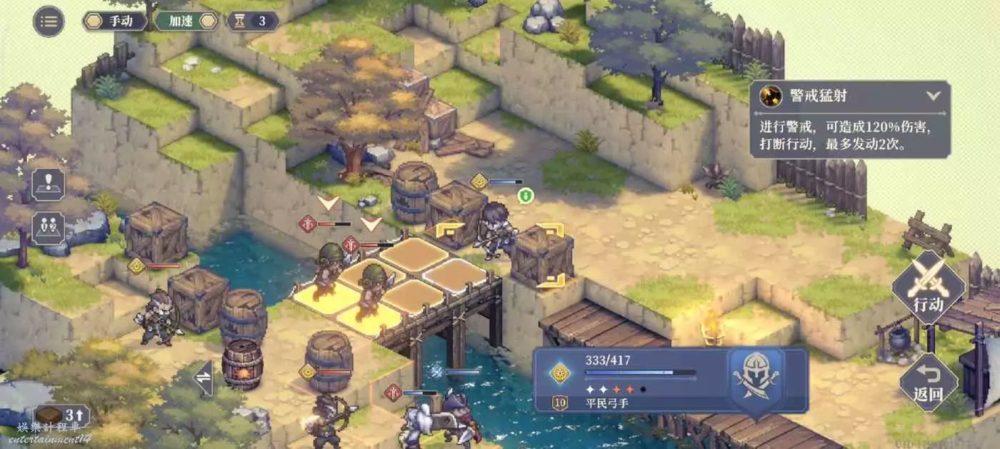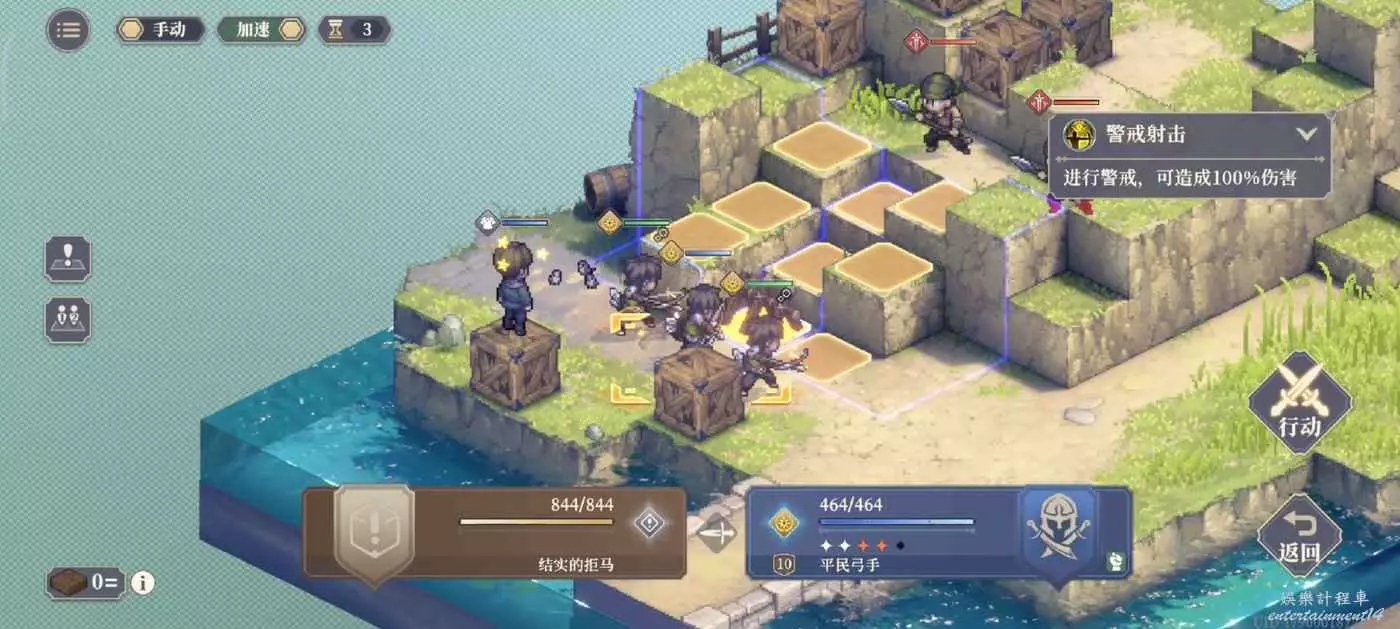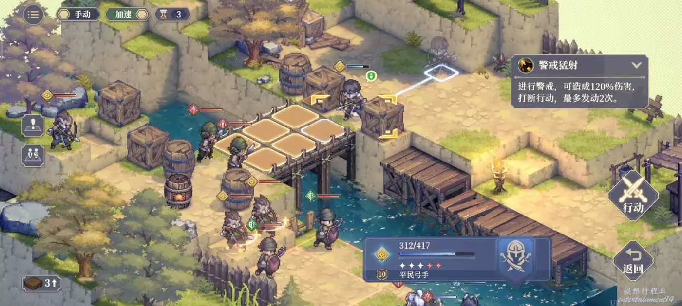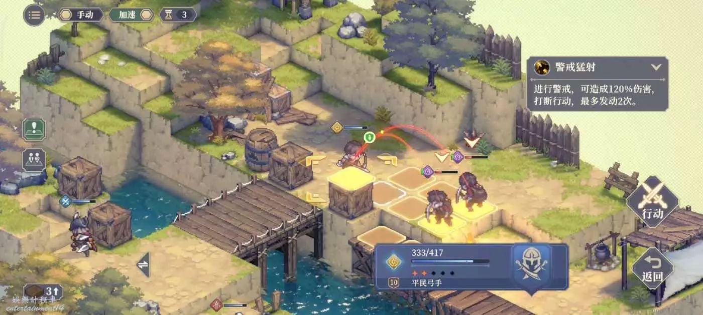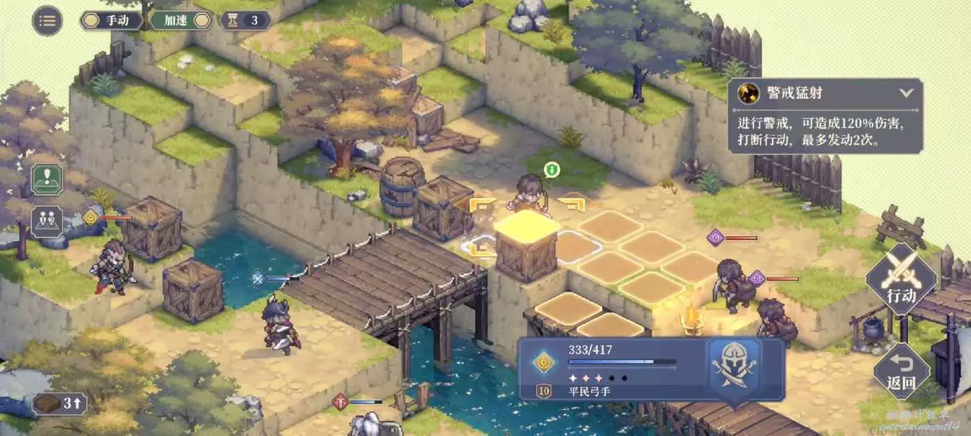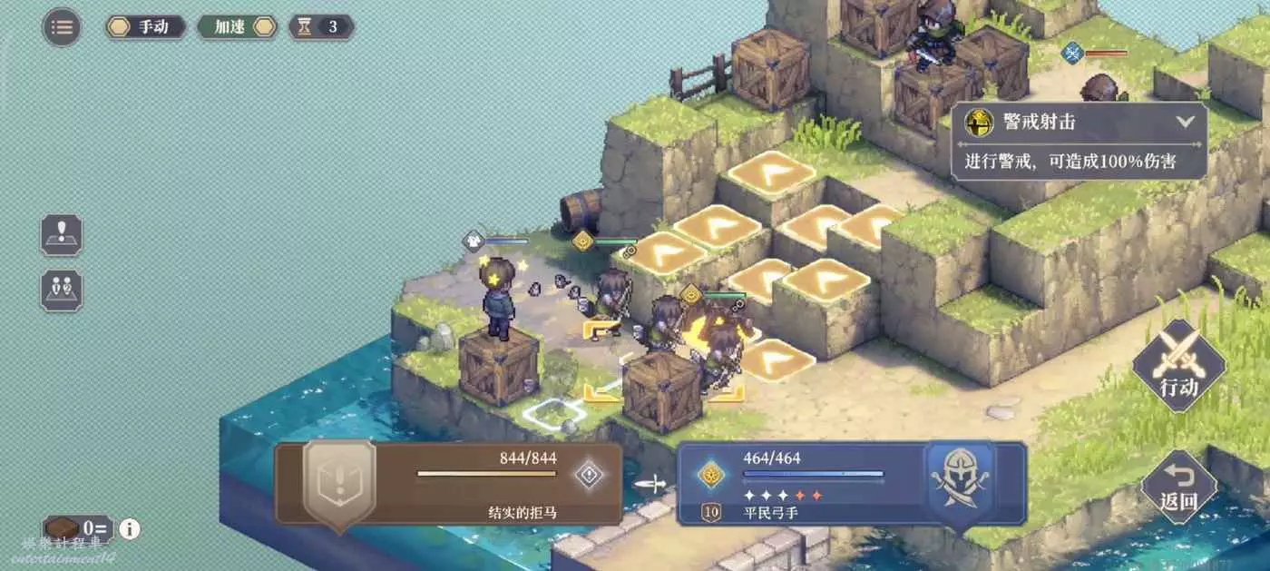 平民弓手:移動到另外兩名平民弓手中間,向前施放【警戒射擊】。長按螢幕即可選擇被木箱擋住的格子。不移動到此格子,另外兩名平民弓手不會施放【警戒射擊】。