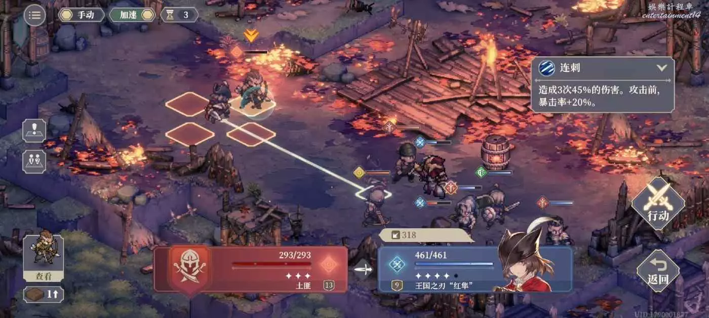 紅隼:敵人行動後,施放【連刺】攻擊站位靠後的敵方粉碎者。目標被擊敗。隨後移動到敵人攻擊不到的格子。