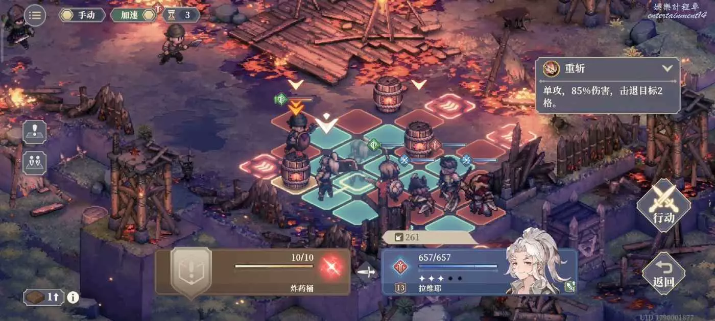 拉維耶:施放【普攻】攻擊敵方守望者。目標被擊退撞擊炸藥桶,炸藥桶爆炸,目標被擊敗。之後回合一直原地待機即可。