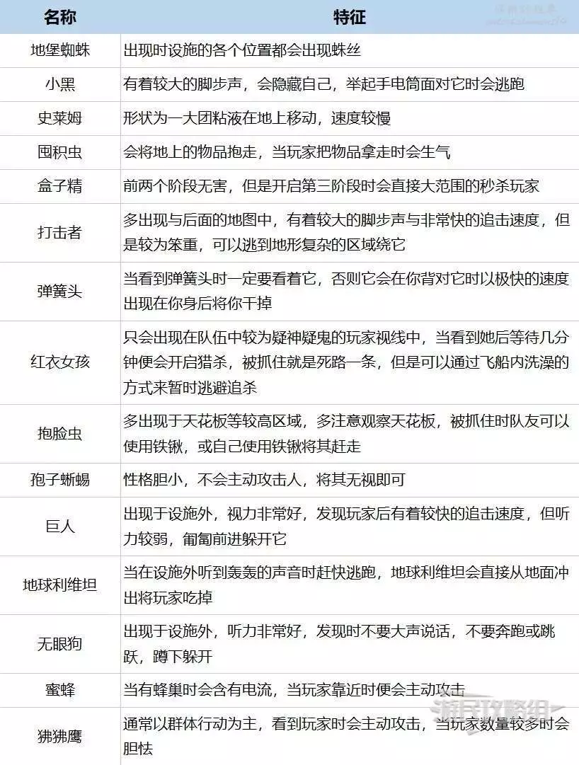 怪物在設施內外皆有分佈,除了沒有蜂巢的蜜蜂與鳥其他怪物看到玩家就會啟動攻擊模式,怪物的攻擊模式各不相同,彈簧人檢測到玩家後,只要玩家的視線沒看它,便會以極快的速度發起攻擊。會棲息在黑暗中從背後偷襲玩家的黑色怪物,當孤身一人時不會攻擊玩家但集群出現會表現出強烈攻擊慾望的狒狒鷹。當怪物沒有發現玩家時則會在設施內/外四處遊蕩。