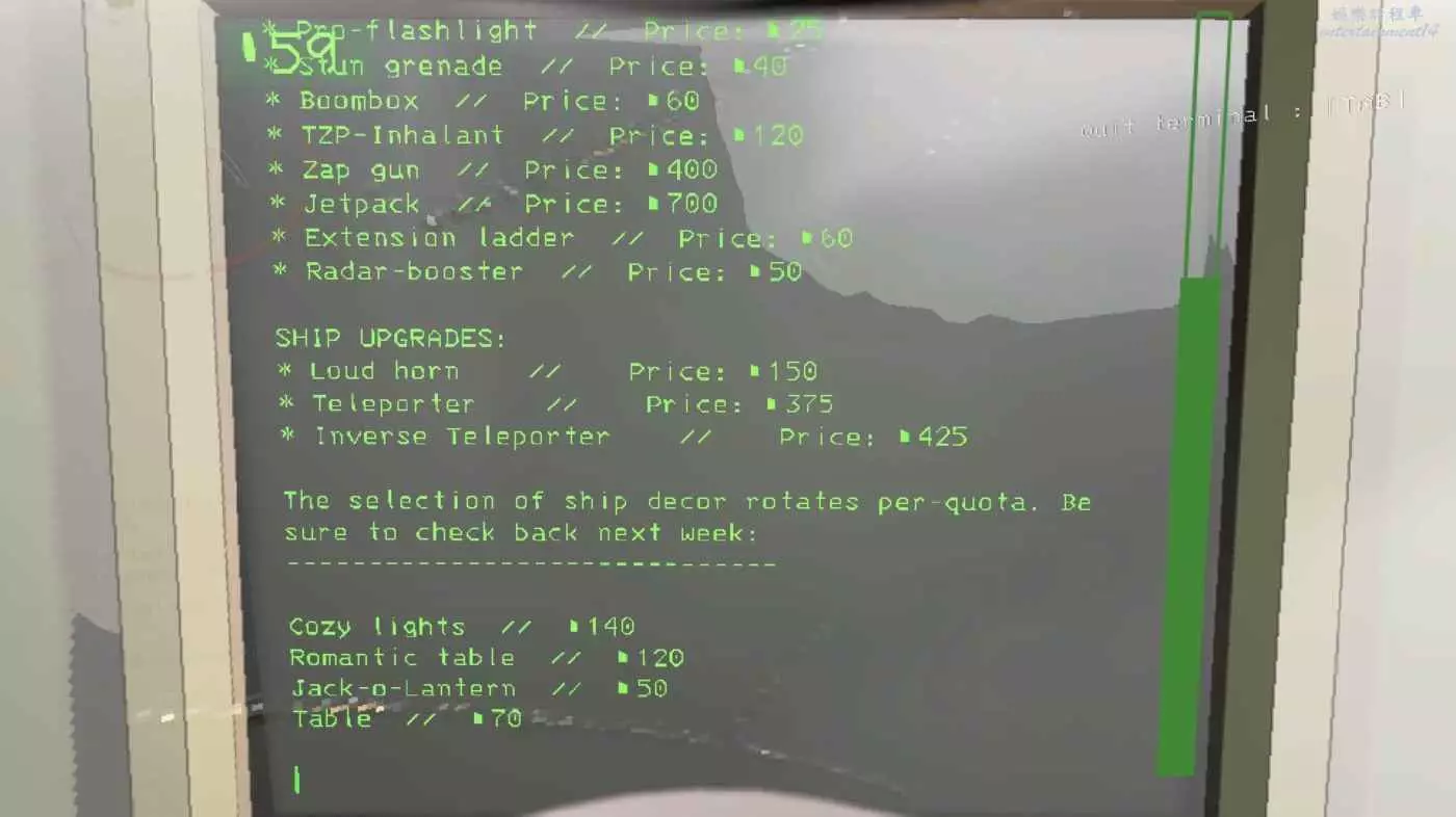 後面的關卡會越來越難,例如 S+ 的泰坦,可以留一名玩家在飛船上遠端支援和觀察玩家所在區域範圍,並通過控制台(電腦)來協助玩家開啟設施中被關閉的安全門。而電腦也可以用來購買物品、選擇地圖、控制”設施”中的安全門外,還能儲存飛船上的陳設倉庫,以上的操作都需要玩家手動輸入對應指令代碼來進行相應操作(無視大小寫)也可以打關鍵字,例如:Boombox 可以直打 Boom。數量則在後面加斜杠+數字(// 2)= Boombox // 2 會一次買到兩個音響。