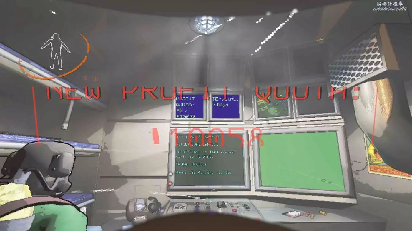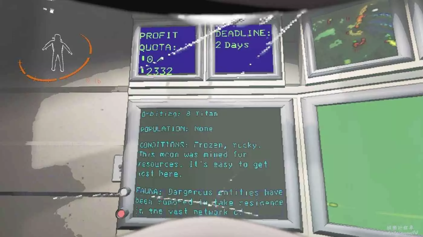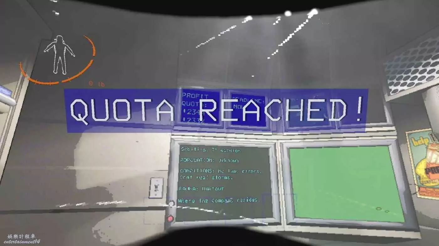 ▲遊戲指標監視器:未開始關卡時,當前是顯示的是目前地圖的摘要資訊。抬頭看,左側分數是已出售的指標/右側是所需滿足指標;旁邊天數則是當前剩餘天數,當天數為 0 時仍可前往公司,但如果天數為 0 時,還未滿足指標的話則遊戲結束,所有玩家會被當作垃圾排出太空,而如果在遊玩中所有玩家在探索中死去,飛船會直接撤離,同時船艙內的所有戰利品會消失,建議後期避免該情況出現至少留一個人在船上,建議在晚上之前起飛。每次結案也不要過度銷售撿來的戰利品,要為下一個配額節省一定的量(現金流周轉)。