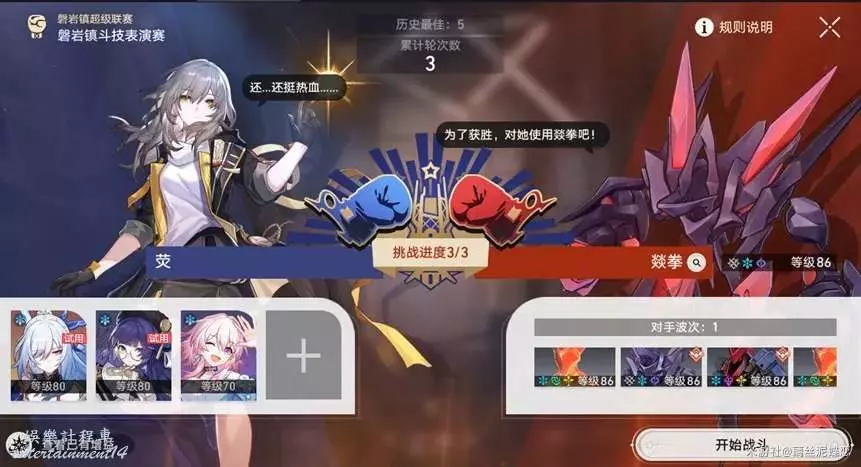 第一關:第1波,佩拉e火鳥,三月七a凍結火鳥,鏡流e火人,佩拉a火鳥然後立馬開大招解決掉剩下兩個不然就超出1輪了。第2波,佩拉e火人,三月七e佩拉增加佩拉被攻擊的幾率,鏡流e凍結火人,佩拉q或者三月七q(因為這裡三月七和佩拉的大招會差一點能量,所以主要看對面敵人攻擊的哪個角色幫忙補上那點能量)凍結剩下兩個火人,鏡流q直接秒殺剩下兩個。輪次:1