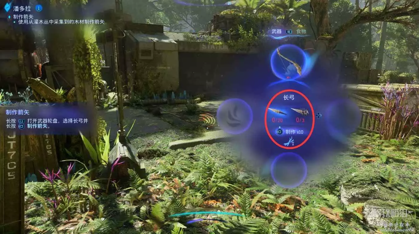 打開武器輪盤,選擇長弓然後製作箭矢。戰鬥時箭矢消耗較大,建議多採集些矢木叢以備不時之需。