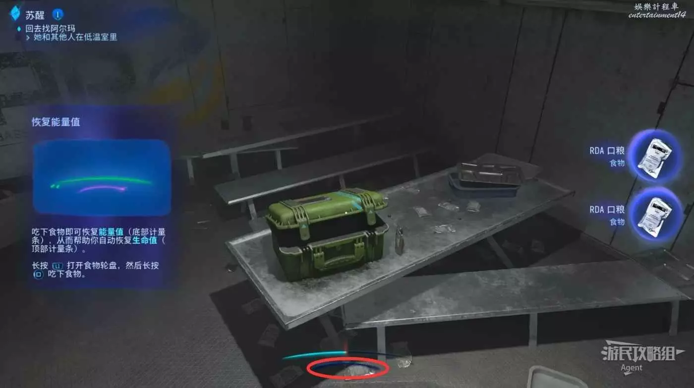 吃食物可以恢復血條下方紫色的能量值,消耗能量值會幫你自動恢復血條。