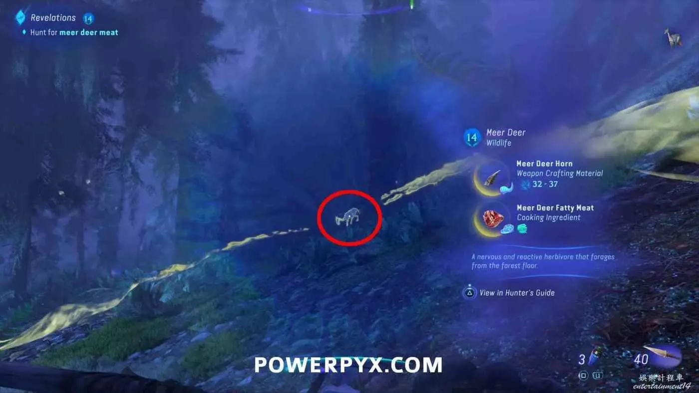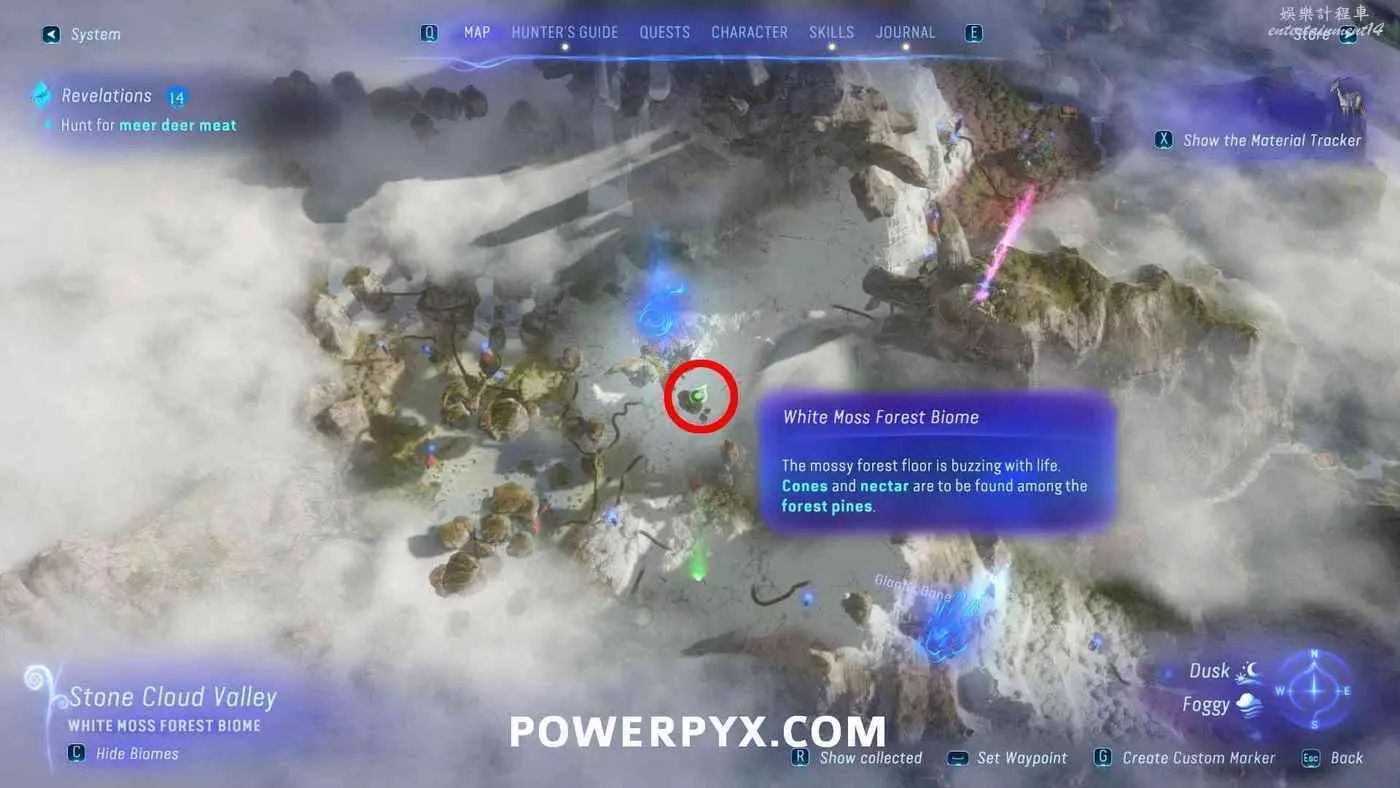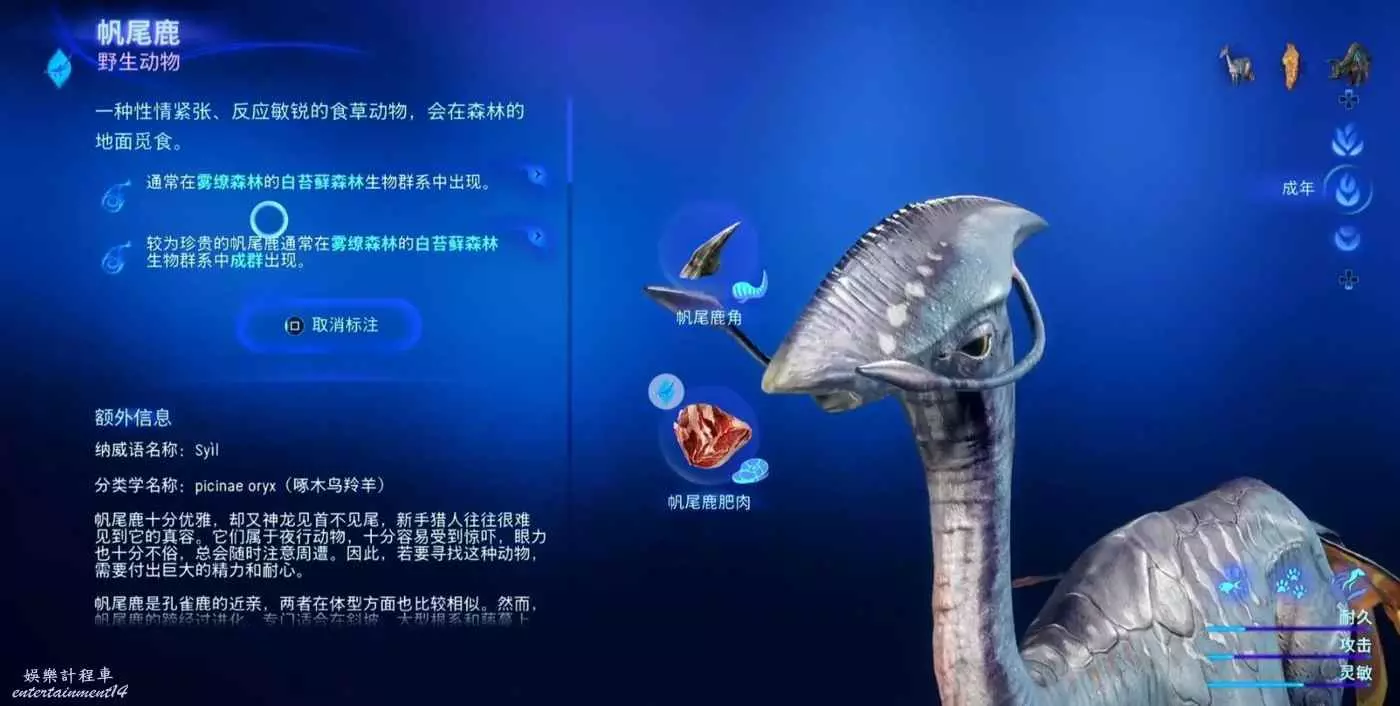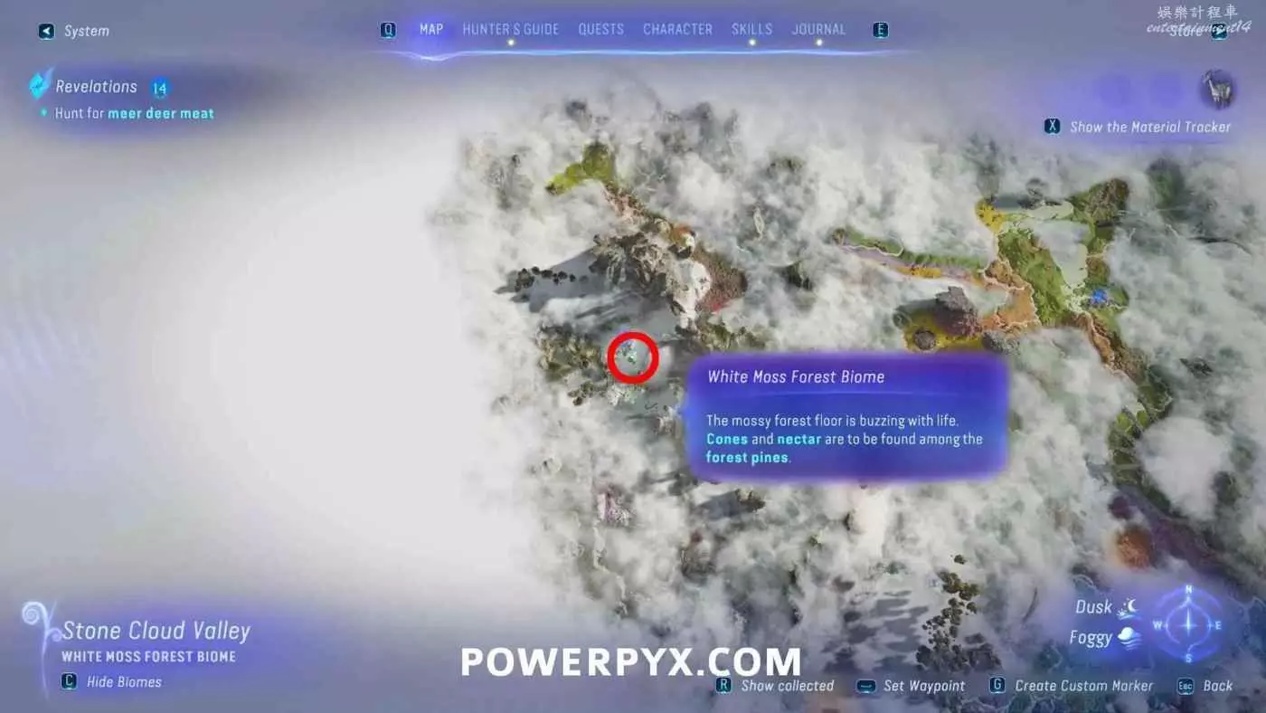 當然也可以在【獵人指南】→類型→野生動物→【帆尾鹿】一項下自動追蹤(需要接受【真相大白】主線任務才能解鎖此項),這樣當帆尾鹿在附近出現時,就會顯示黃線提示。在世界地圖上按【十字鍵上(或PC端鍵盤的C鍵)】來顯示生物群落,上面會顯示白苔蘚森林,在此區域的任何地方都有幾率找到帆尾鹿。