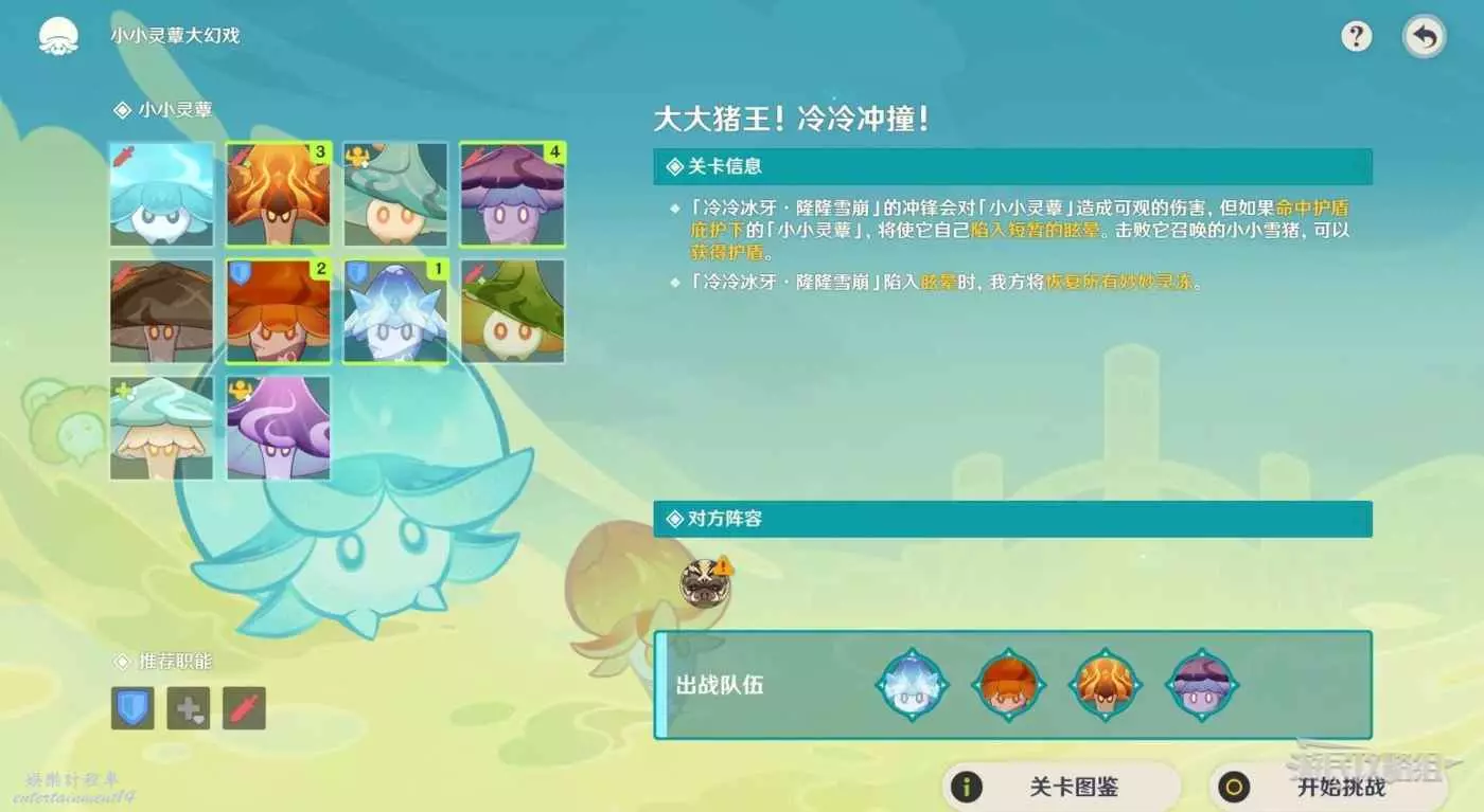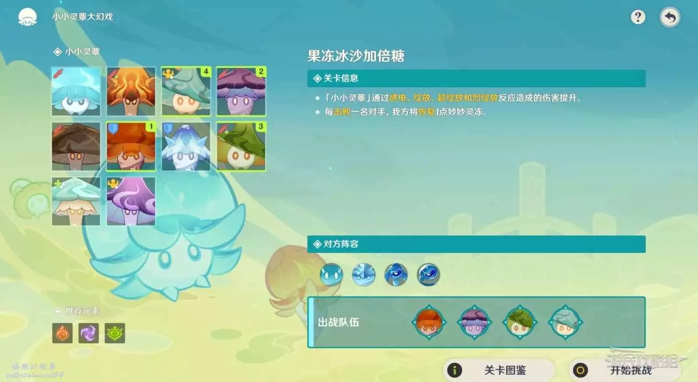 在【蕈獸可不是汐藻!】任務期間,與NPC對話結束後自動進入活動關卡選擇頁面,選擇第四關【果凍冰沙加倍糖】。對方陣容為水史萊姆、冰史萊姆、浞水之靈,所以推薦選擇火+雷+草元素的蕈獸來頻繁觸發感電、綻放、超綻放、烈綻放以打出傷害。同時建議加入轉轉悠悠獸來聚怪。