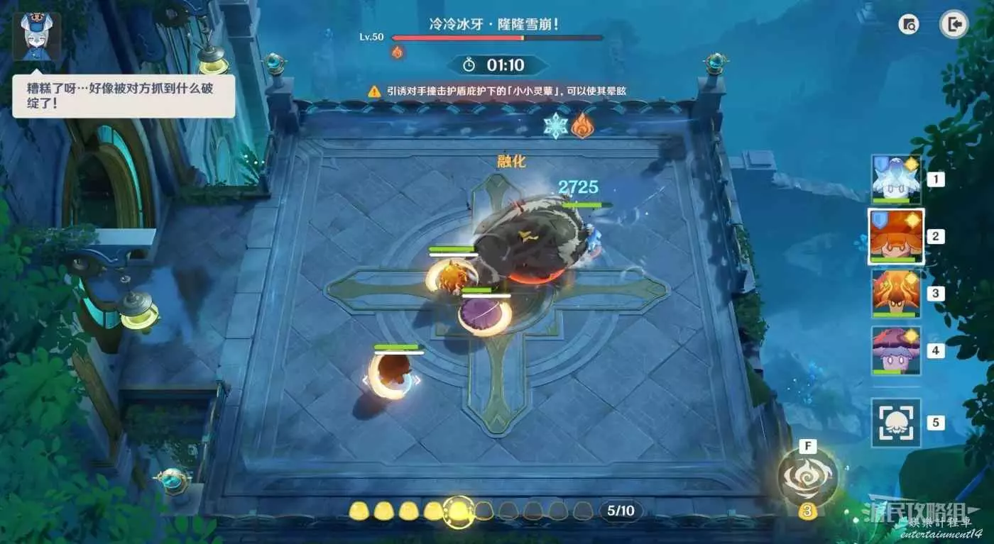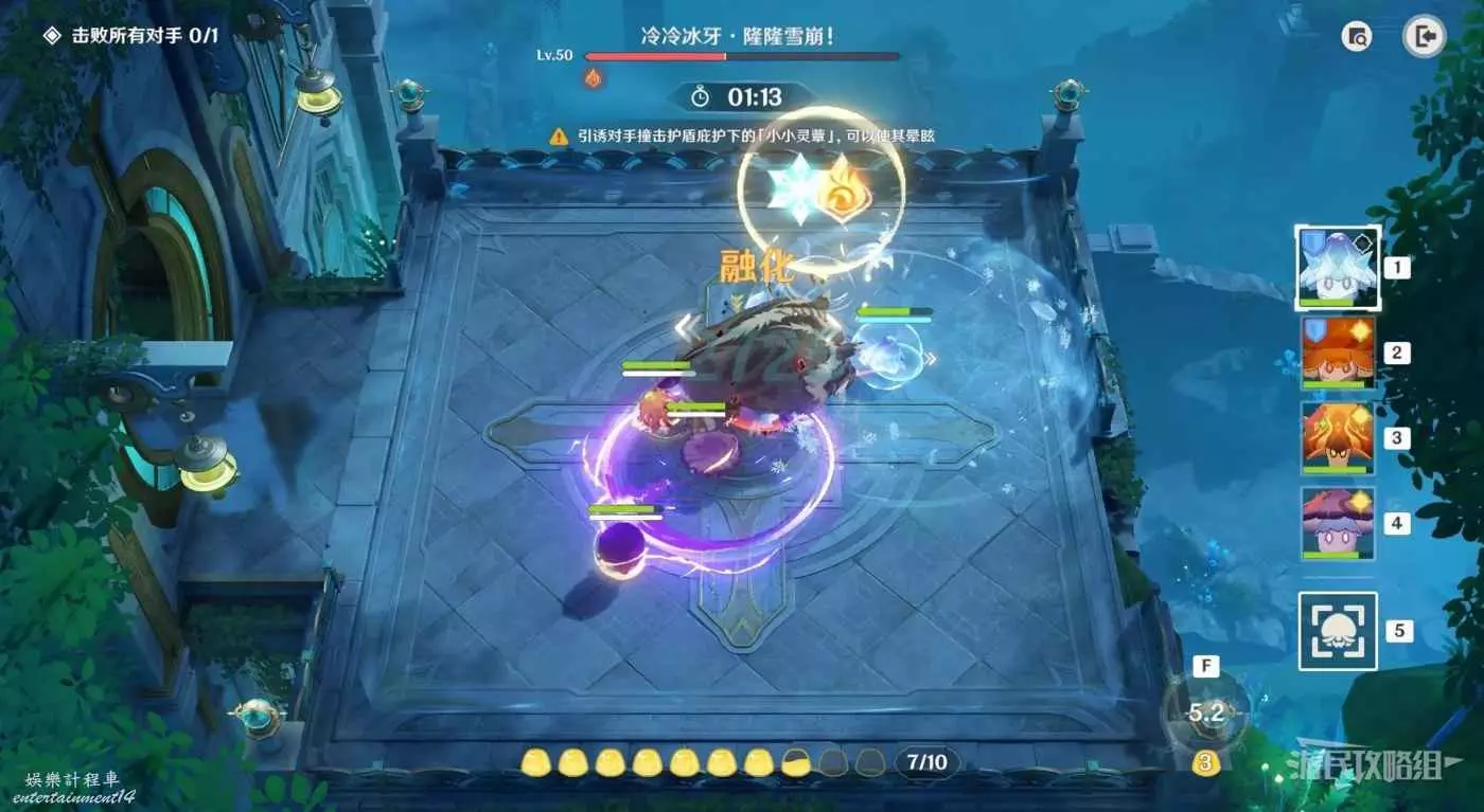 注意本關的目標需要讓對手陷入眩暈1次,所以可以考慮選擇帶有護盾的蕈獸上場,或者抓住時機拾取擊敗場上的小雪豬掉落的寒冷祝福來獲得護盾,在有護盾的狀態下應對對手的衝撞即可使其眩暈。