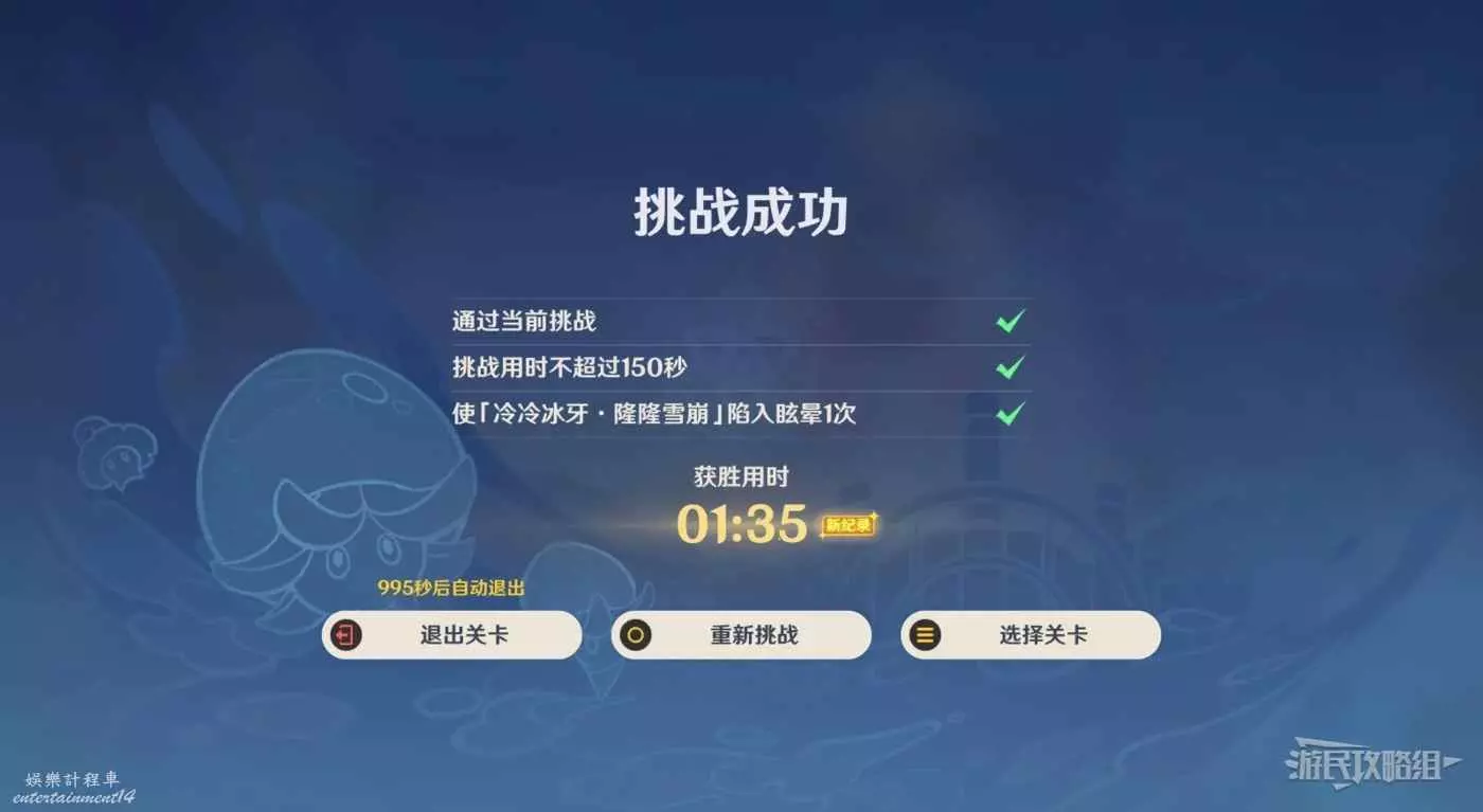通過當前挑戰;挑戰用時不超過150秒;使「冷冷冰牙·隆隆雪崩」陷入眩暈1次