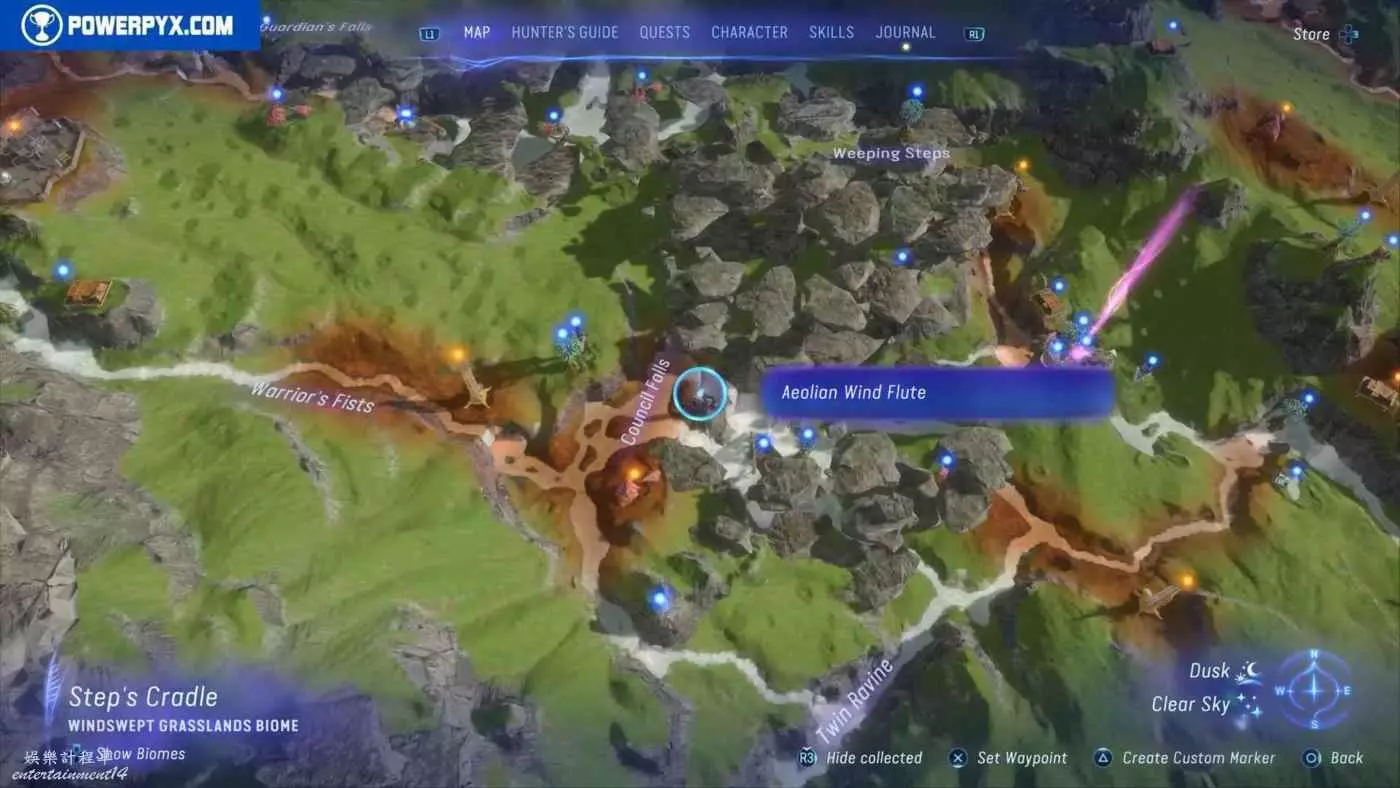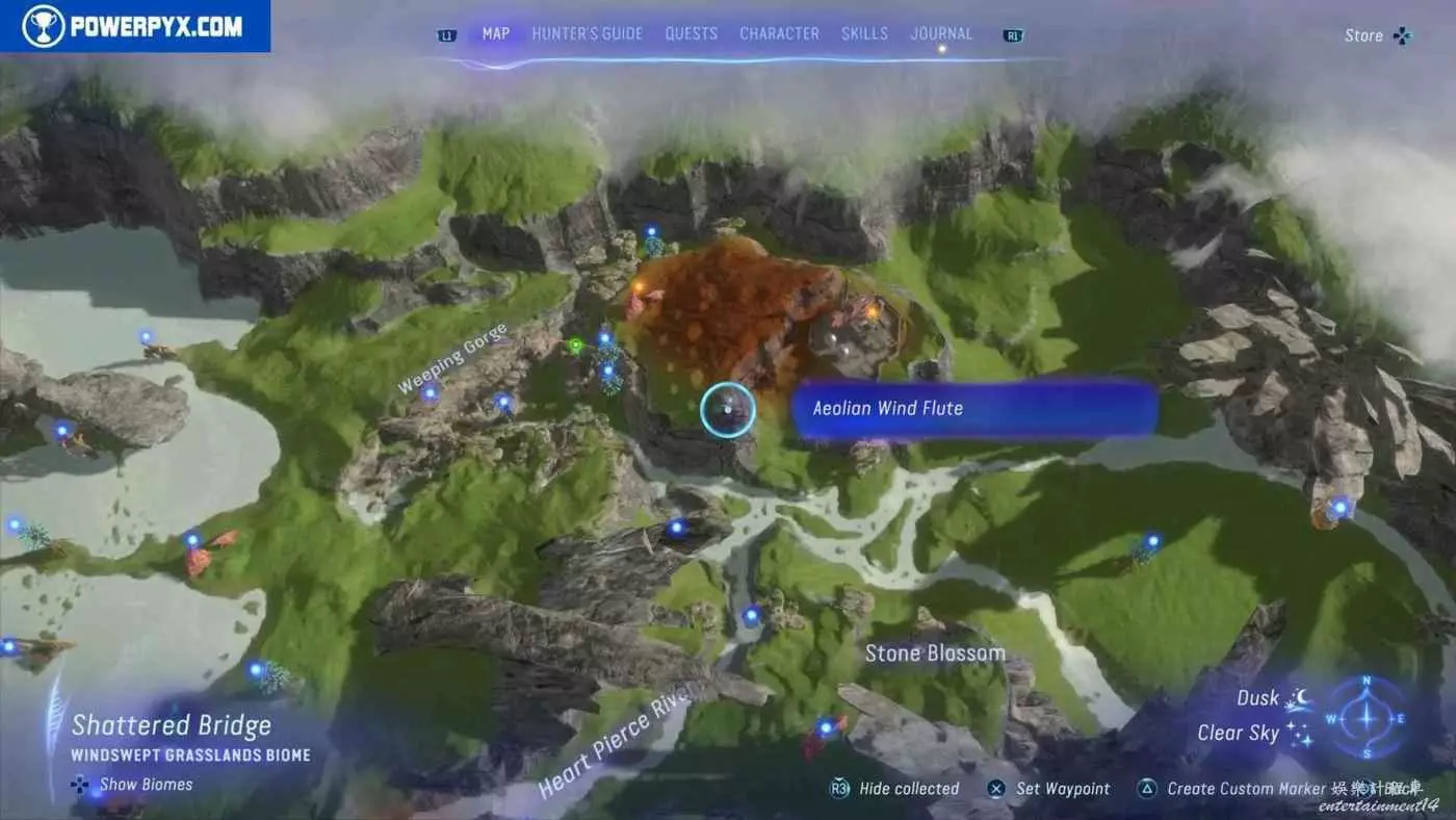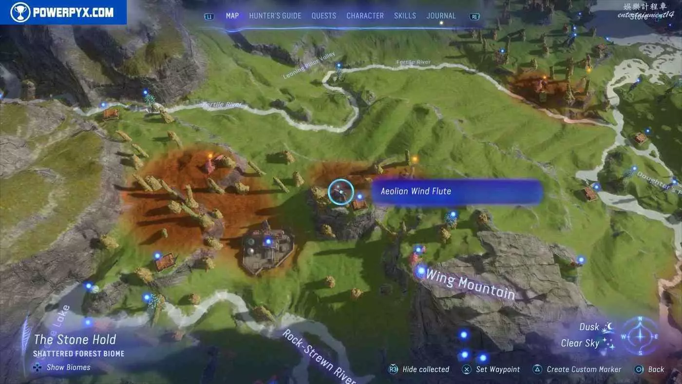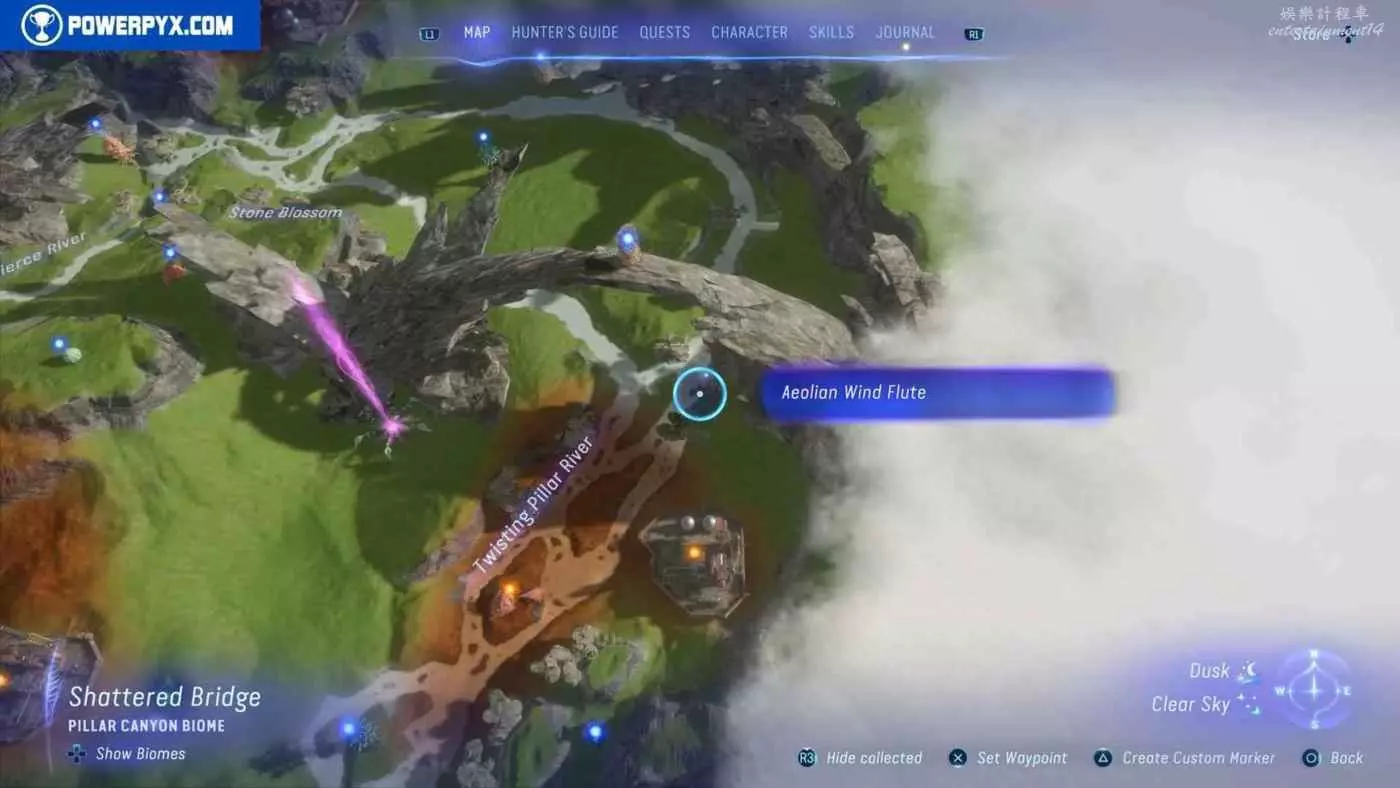 只需要與每個艾奧利安風笛所在位置的控制杆互動為其調音即可,所有的艾奧利安風笛都不用擔心漏掉,在通關主線後的開放世界依然可以前往其位置並為其調音。清除地圖迷霧時也會標記在地圖上,如果之前沒有靠近過,會顯示紫色標記,如果之前已經靠近過該位置則會顯示藍色標記,如果之前已經完成就會顯示綠色標記。其中4個與主線劇情相關的艾奧利安風笛不會在地圖上標記顯示,也不會在PS5獎盃列表中追蹤數量(只記錄開放世界中的13個),所有艾奧利安風笛都位於本作的第二個主要區域上層平原。