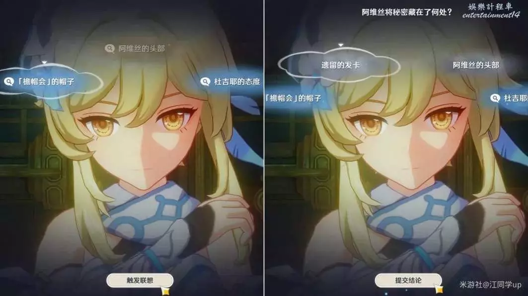 (3)點擊上圖【進行聯想】後,接著選擇【「簷帽會」的帽子】,再點擊【觸發聯想】,最後選擇【遺留的髮卡】後點擊【提交結論】,即可完成該次推理解密
