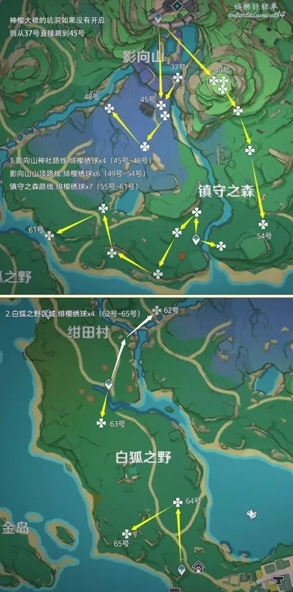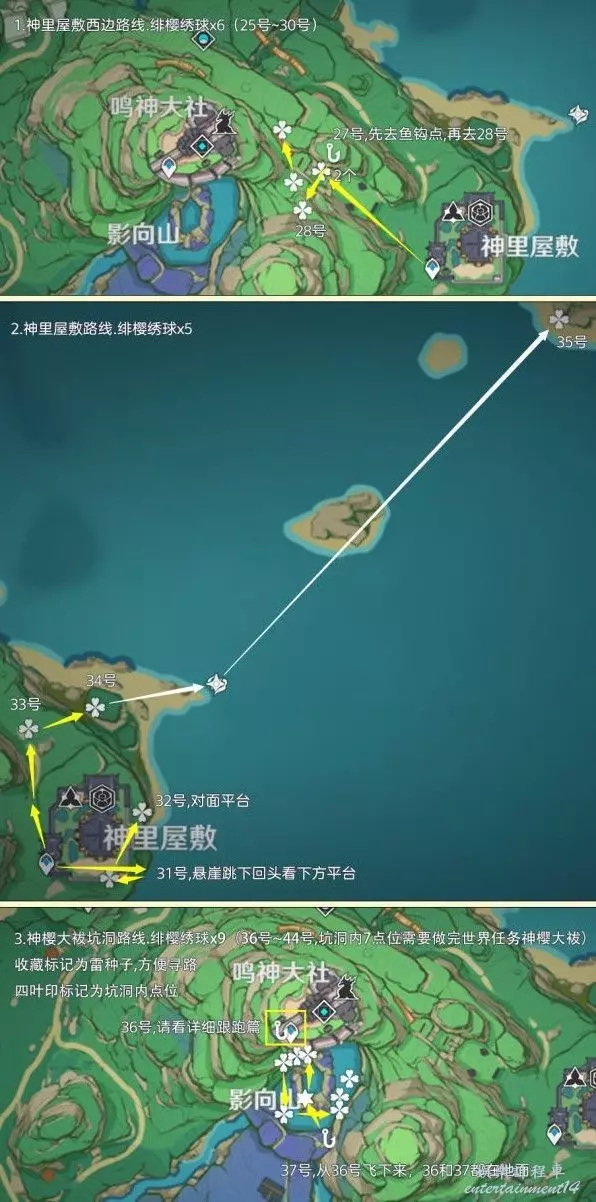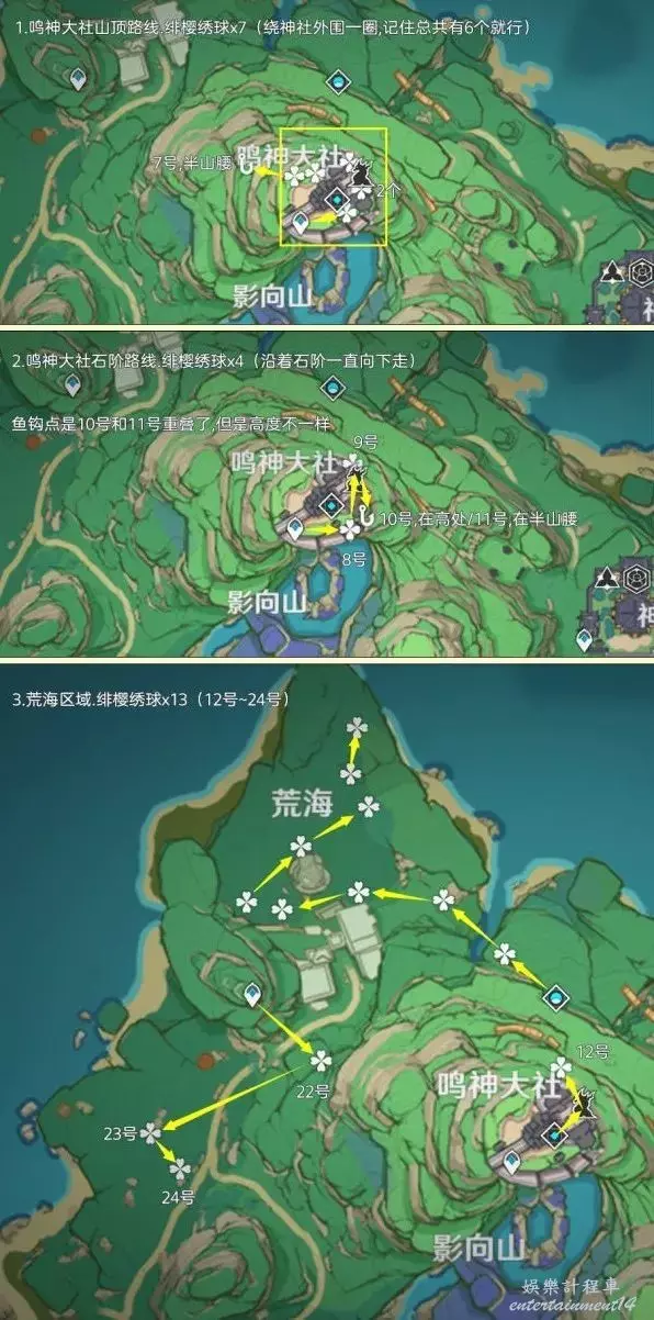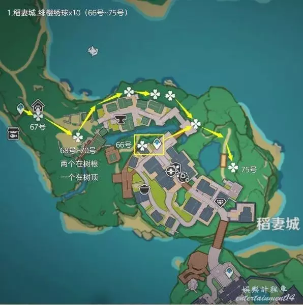 緋櫻繡球點位僅分佈在稻妻鳴神島地區內,其中可採集數量為75個,製作路線時儘量遵循從上往下游,視野高好看清,方便旅行者探索