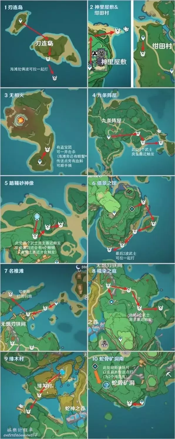 綾華以及即將複刻的雷神都是刀鐔大戶,本路線在我之前的路線上進行了更改與補充,篩選了稻妻三島中10個高效、易於跑路的武士點位。這些點位不僅點位密集,而且適合溫蒂聚怪(注意有好幾個點位溫蒂可以拉在一起聚),每天僅需花費少量時間就能輕鬆收集100+刀鐔。