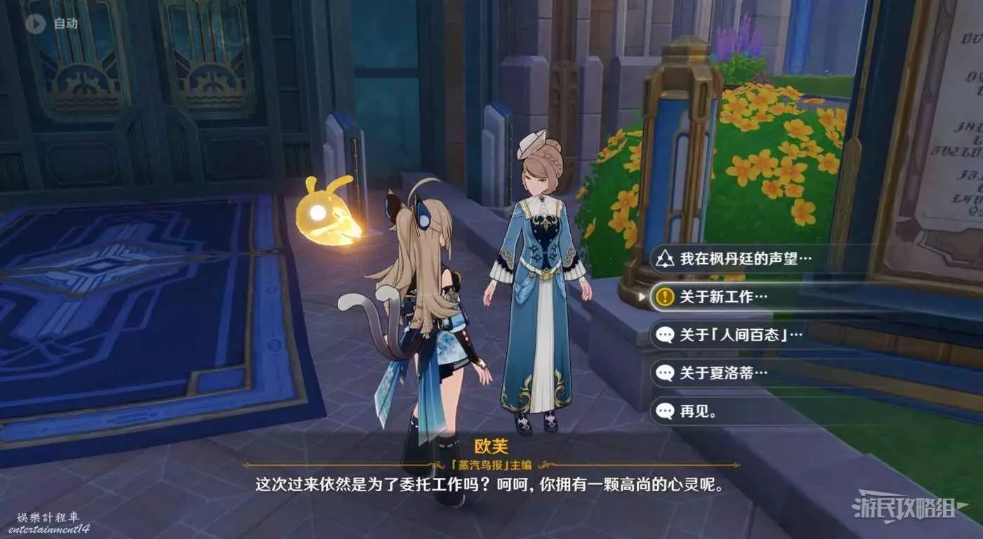 完成世界任務【「蒸汽鳥報」的面試】、【問題美露莘和答案機器人】和「【曙紅即興詩】後,與蒸汽鳥報的主編歐芙對話,選擇【關於新工作】。