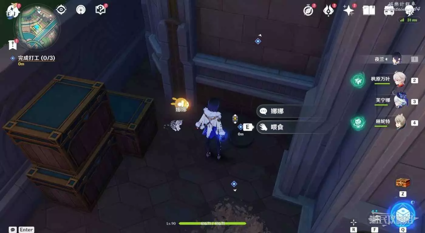 切換一名水元素角色,清理地上的兩攤污漬,屋子前後各有一個。然後消耗一塊魚肉喂貓。