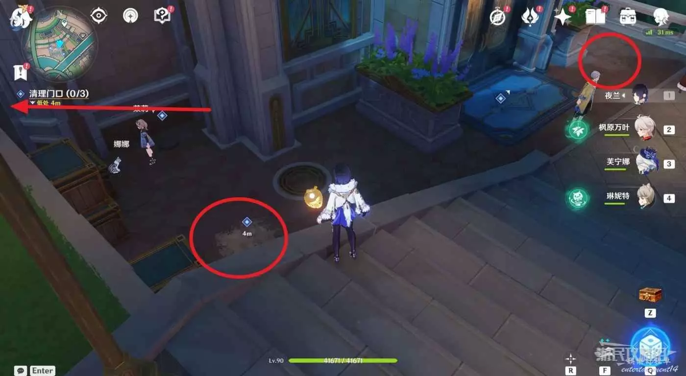 對話完畢後,繼續用一名水元素角色清理門口的三處污漬。