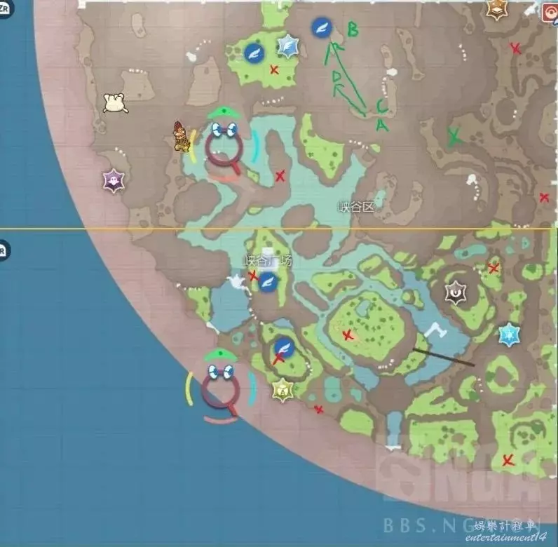 峽谷區有14位對戰NPC,其中10位在地上,這裡用紅標標註,直接去紅標所在地就可以看見。