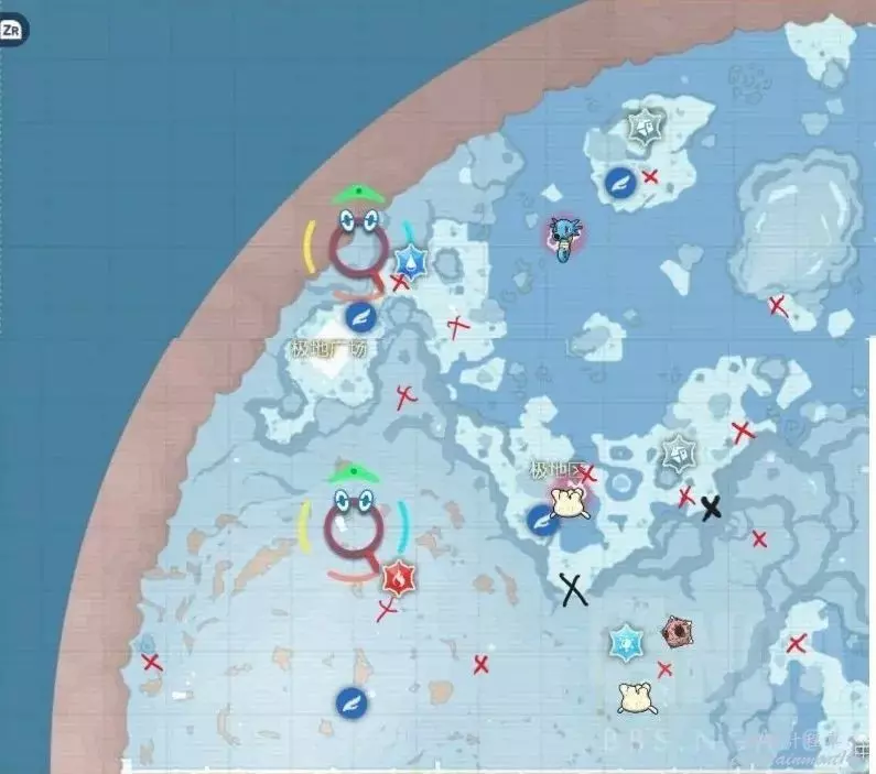 極地區16位NPC,14位在地面上,直接去紅標標註位置。還有2位在洞窟裡,兩個黑標標記處有兩個洞窟入口,從入口進入洞窟直走就能看見兩位NPC。