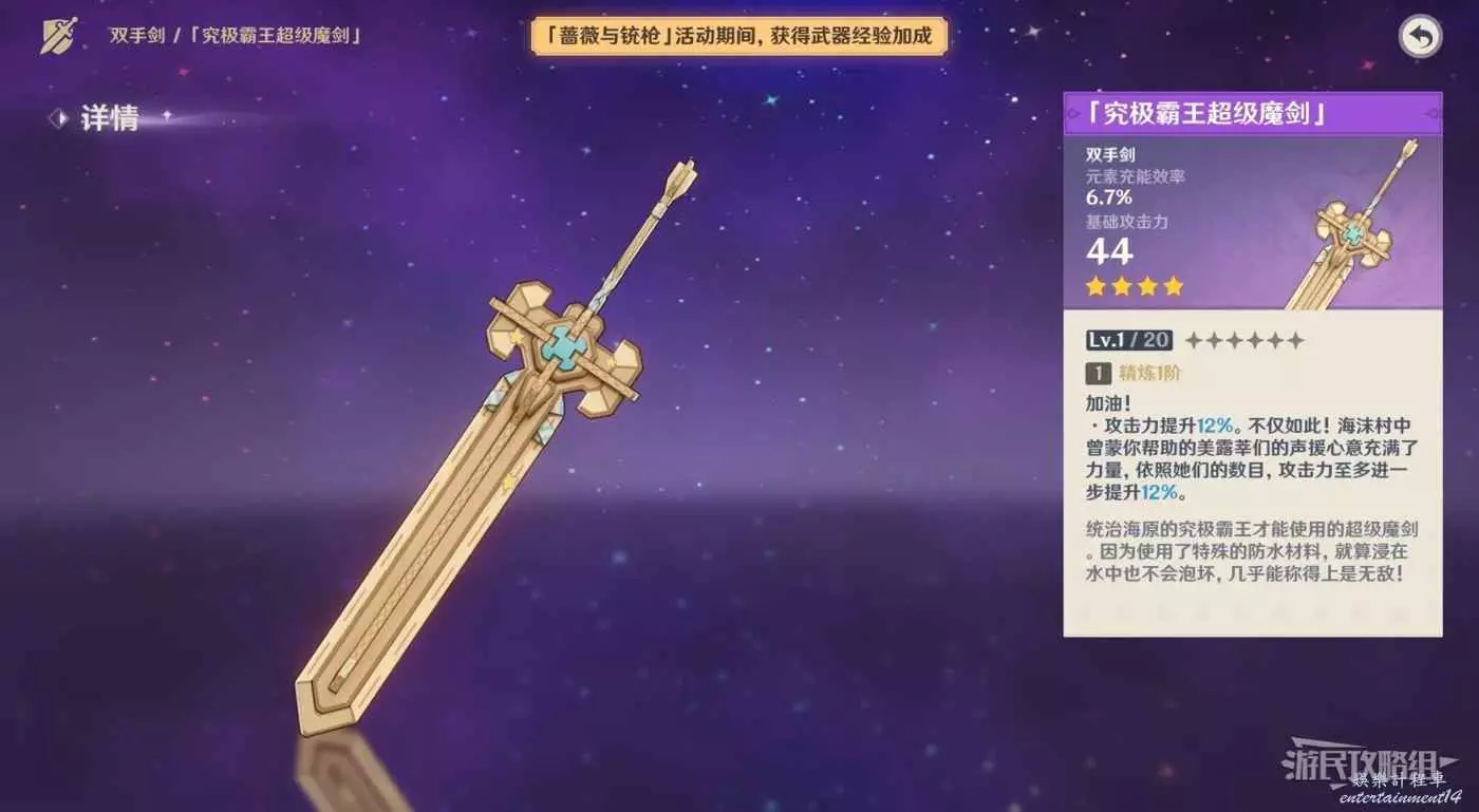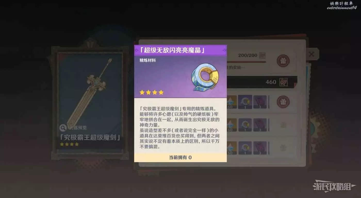 原神 (Genshin Impact) 究極霸王超級魔劍獲取及精煉方法 21 12 月 2023-12-21 廣告 作者:瑞破受氣包 來源:遊民星空 究極霸王超級魔劍獲取方法 通過完成【薔薇與銃槍】的節慶活動和任務來獲得劇戲票券,然後再活動頁面選擇【歡趣贈禮】。 獲得200劇戲票券即可領取【究極霸王超級魔劍】。 究極霸王超級魔劍精煉方法 收集更多數量的劇戲票券可以獲得究極霸王超級魔劍的精煉材料【超級無敵閃亮亮魔晶】。
