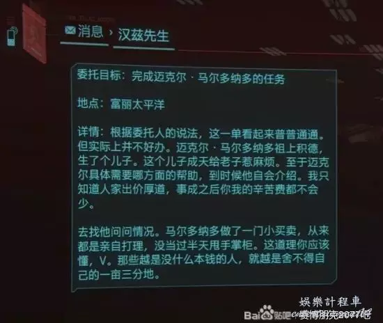 隨任務指引找到邁克爾·瑪律多納多的街機店,開始和他對話,了解任務的詳細情況。