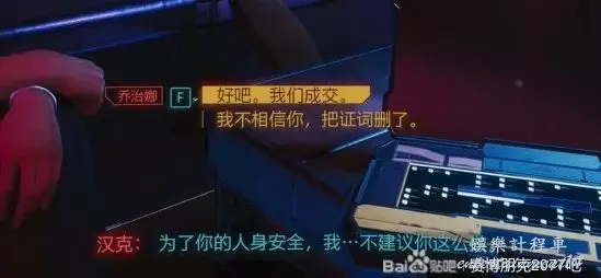 但這事過後吧,老邁後悔了,所以委託V去找喬治娜·澤賓斯基,把偽證的影片處理下。這裡的處理方式會影響結局,一共就兩種結局,下文都會展示。