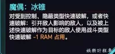 如果你沒看懂這一堆技能說明在表達什麼,那我可以解釋一下。快速破解一共分四類:控制、隱蔽、戰鬥、終結。佇列入侵允許你一次性向單一目標上傳兩個快速破解,它們會按釋放順序先後生效。而如果第一個破解是控制或隱蔽破解,後續銜接的戰鬥破解+60%傷害(嵌入開發效果)並且費用-1(冰錐效果)。只需要先花2ram釋放一個一階的義眼重啟,後續銜接的義體過熱靠著60%的傷害加成可以一口氣燒死非骷髏頭的小兵。這個階段的駭客已經有了不俗的正面戰力,但如何對付骷髏頭精英又成了新的問題。要知道,對骷髏頭精英使用的快速破解RAM消耗全部要+2,對boss級目標則要+5。對於它們,我的建議是使用記憶擦除。